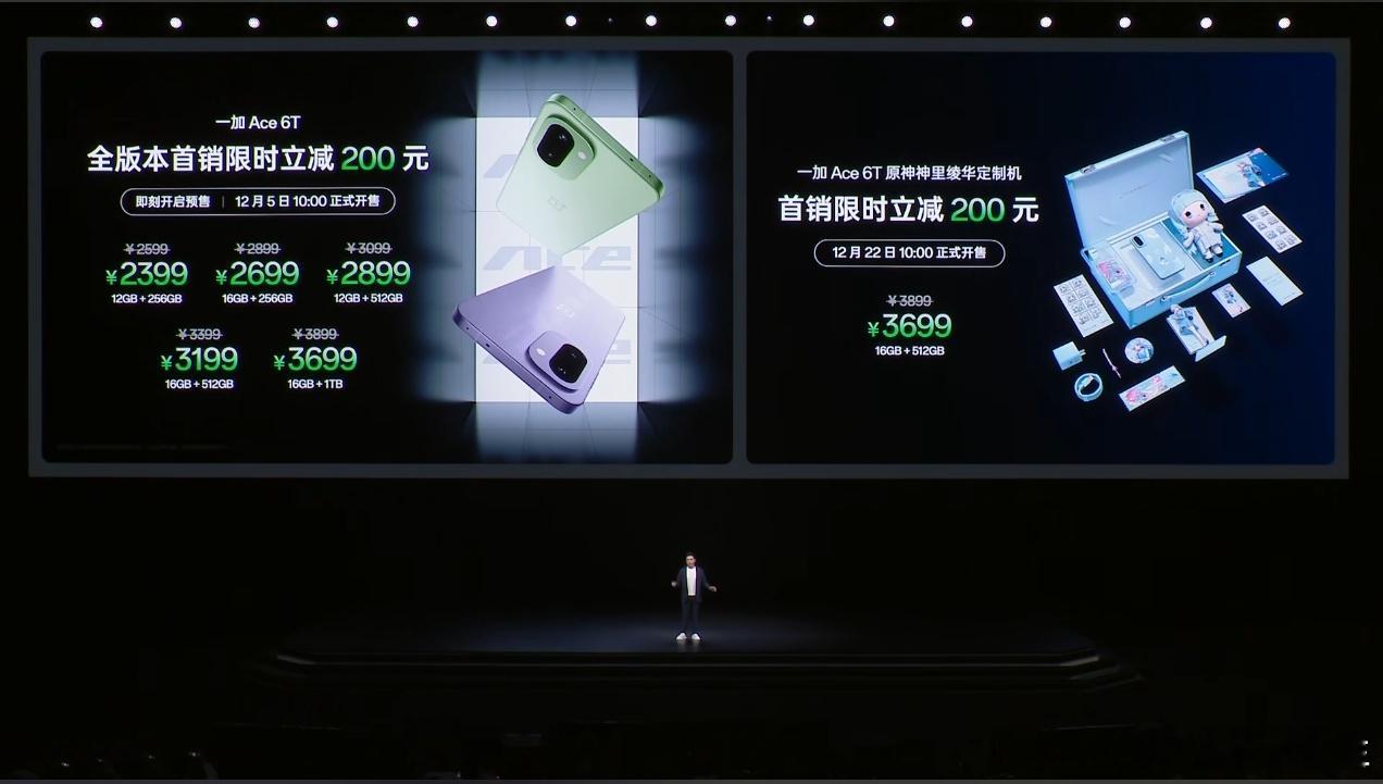 一加Ace6T新品发布价格2399起,原神定制版3699。