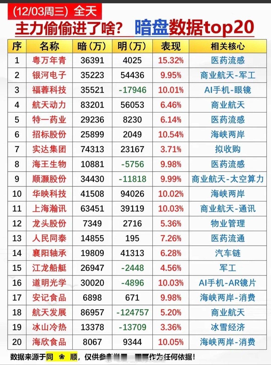 12.03周三 收盘 主力暗盘资金 抢筹监测!1.商业航天,资金抢筹2.医药流感,资金暗盘流向3.海峡两岸,个股反复活跃4.大消费