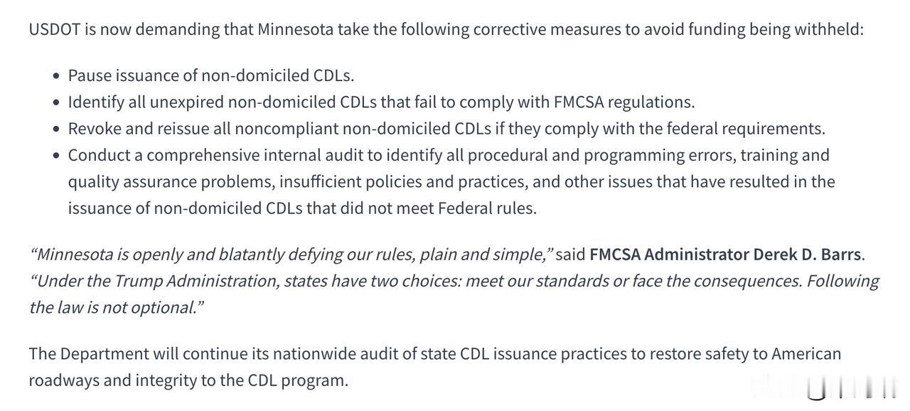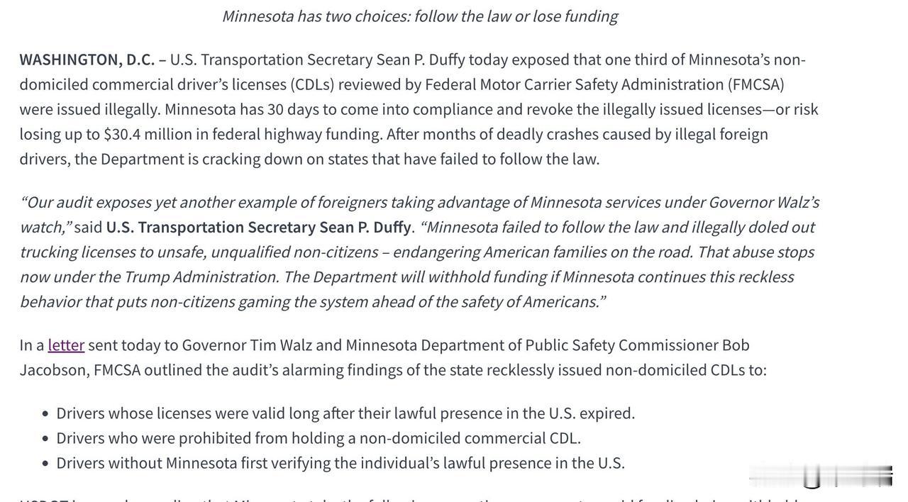 最新消息:美国交通部表示,一项审计发现,明尼苏达州三分之一的非本州居民商业驾驶执照是非法发放的。 “明尼苏达州未能遵守法律,非法向不安全、不合格的非公民发放卡车驾驶执照——危及美国家庭的道路安全。”