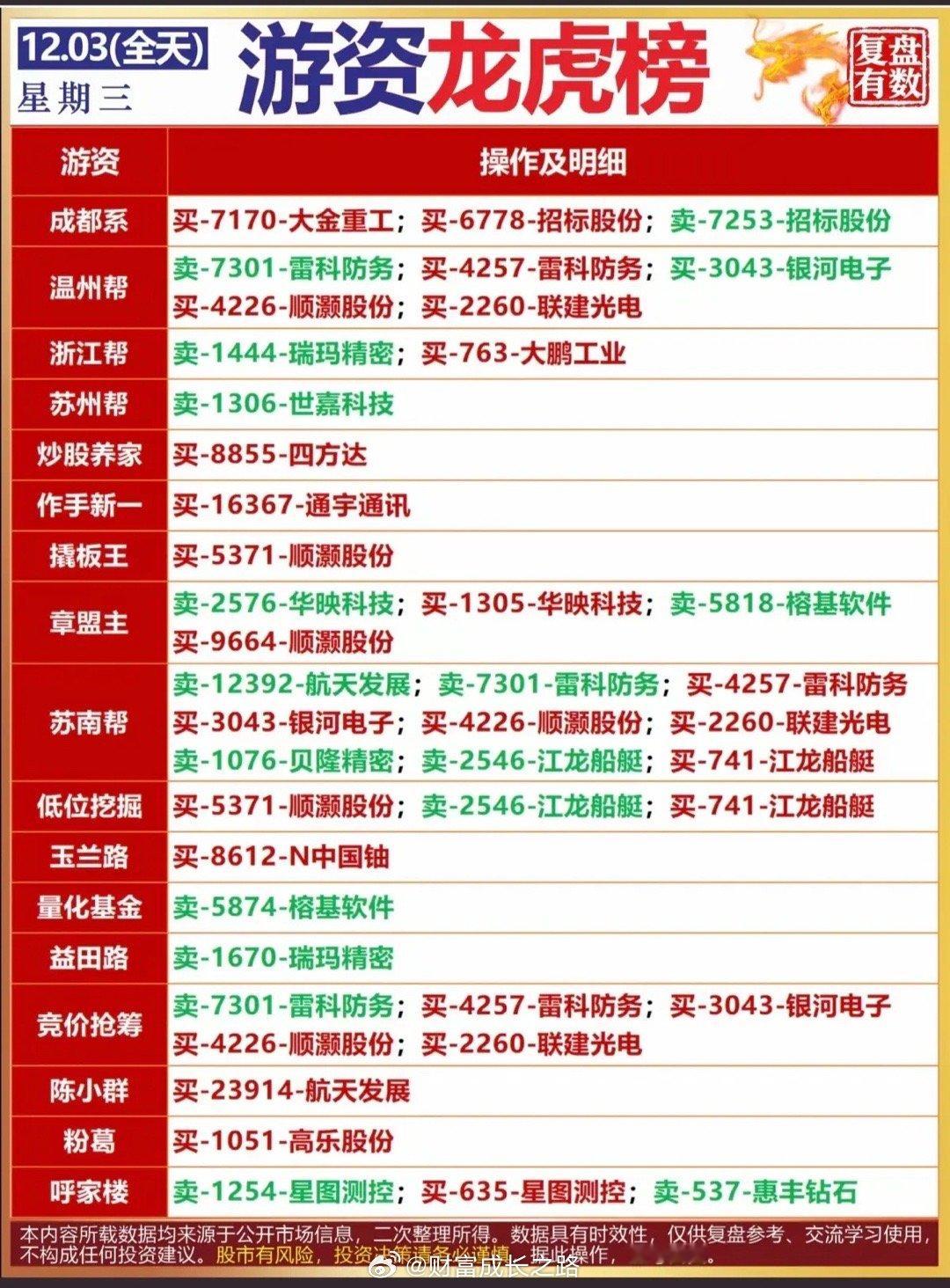 12月3日 周三 收盘 看看“游资龙虎榜”都买了啥股票?多家游资联手大举买入顺灏股份,雷科防务,江龙船艇!获多家游资共同抢筹。航天发展概念,有游资继续抄底!