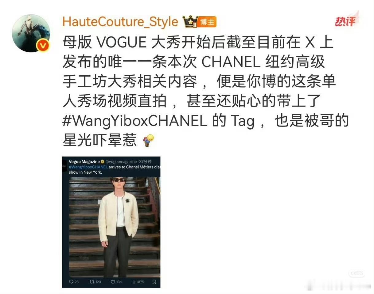 Vogue外网发布王一博看秀相关,vogue母刊官号唯一一条香奈儿大秀内容就是有关王一博的,香门面这块🤏🏻