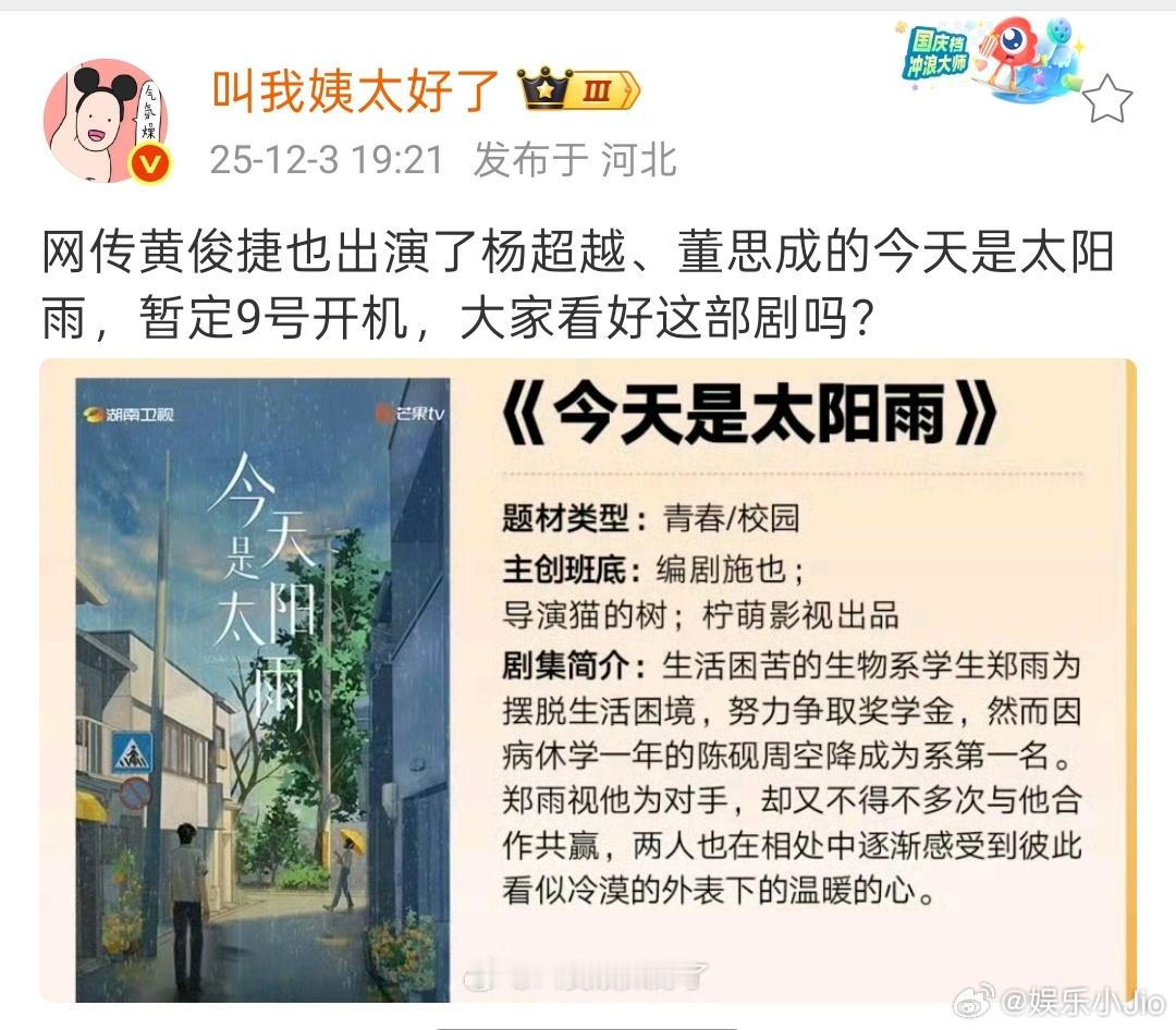 网传黄俊捷出演了杨超越董思成《今天是太阳雨》,它的外形真的跟这个现偶很搭啊,一个电视剧全是帅哥美女,对眼睛很好