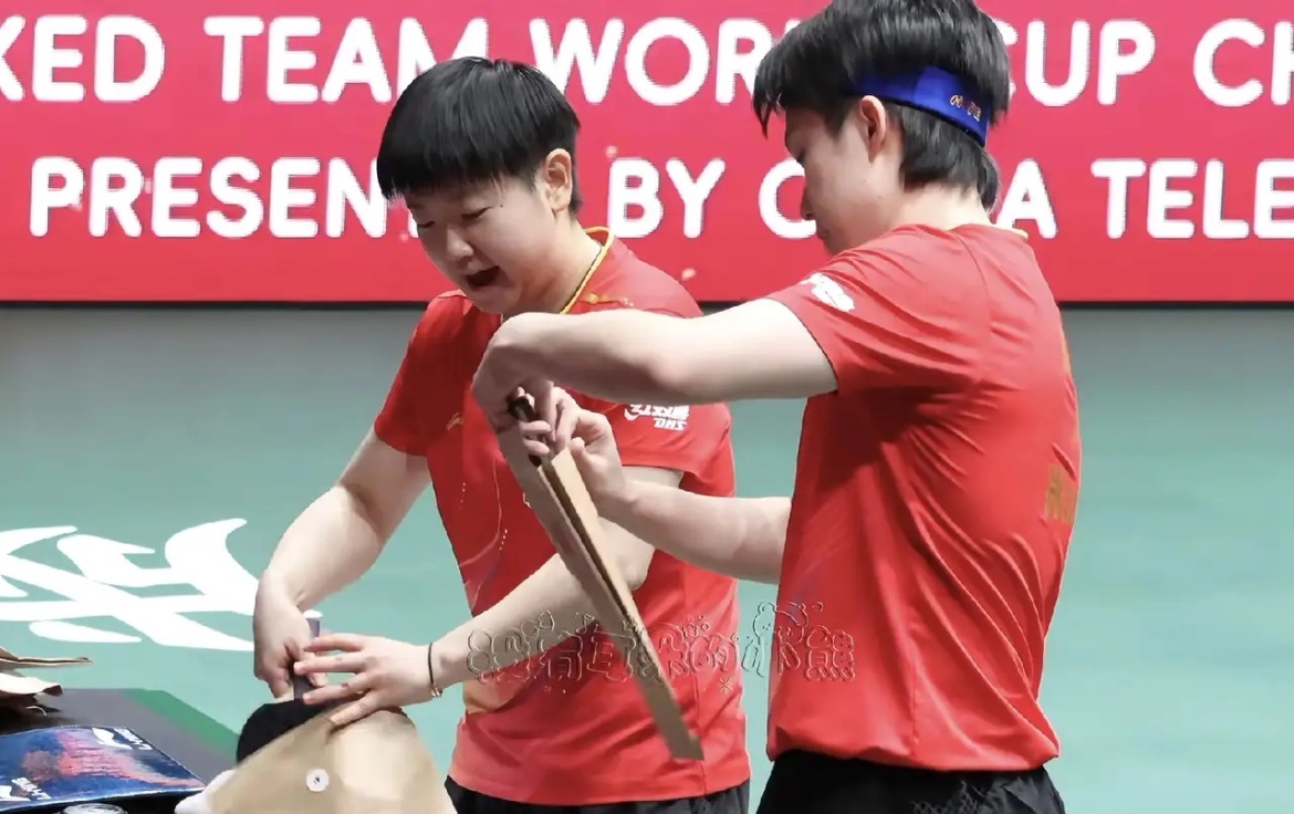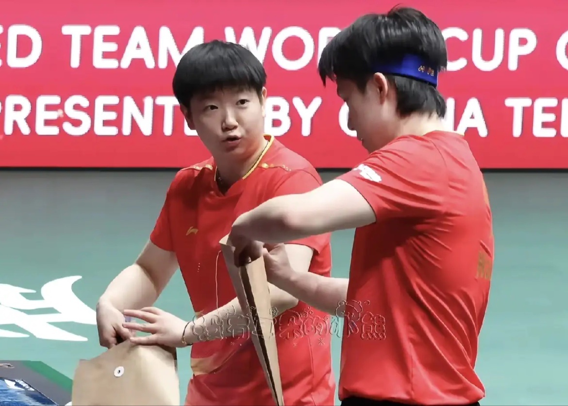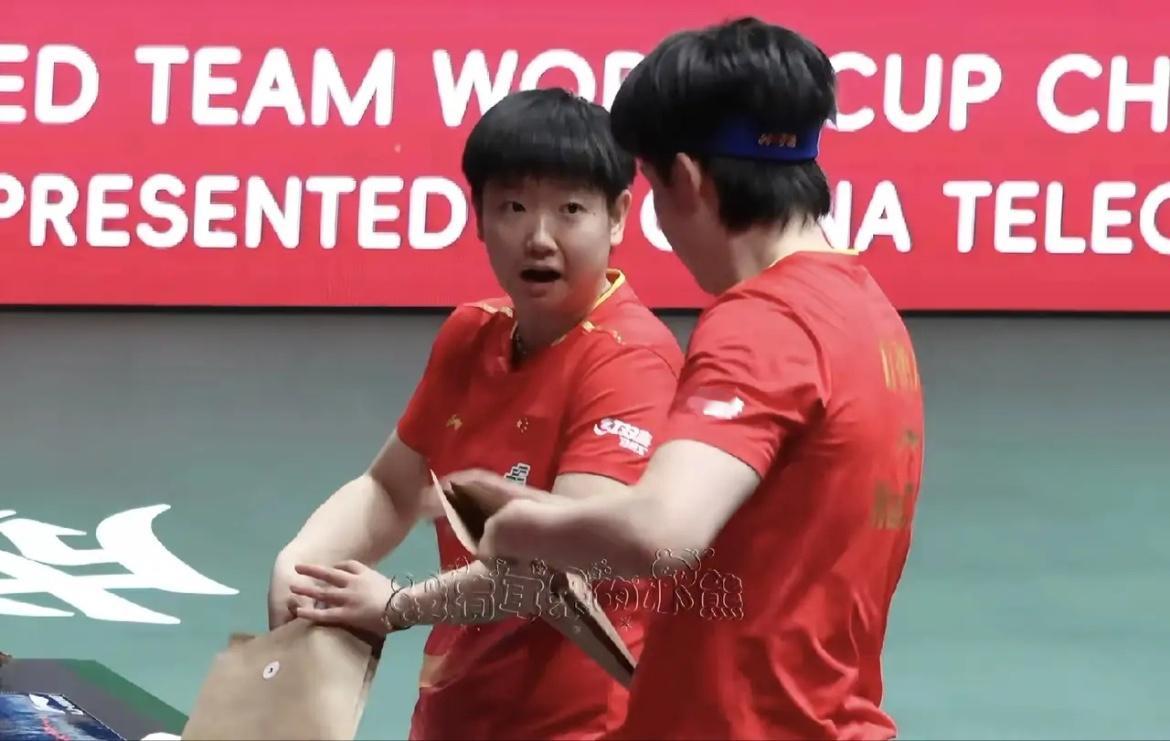 学霸就要现场复盘3-0赢下第一盘比赛,莎头给裁判交拍子,莎莎一边交拍子,一边嘴不停地和楚钦吧啦吧啦。莎莎肯定还有不满意的地方。今天俩人打得丝滑了,莎莎把对手调到一块,楚钦直接秒杀,哈哈一个挖坑,一个埋。无言的默契,一个眼神都不需要,老祖不愧是老祖!今天肖爹也在,俩娃真给肖爹长脸!