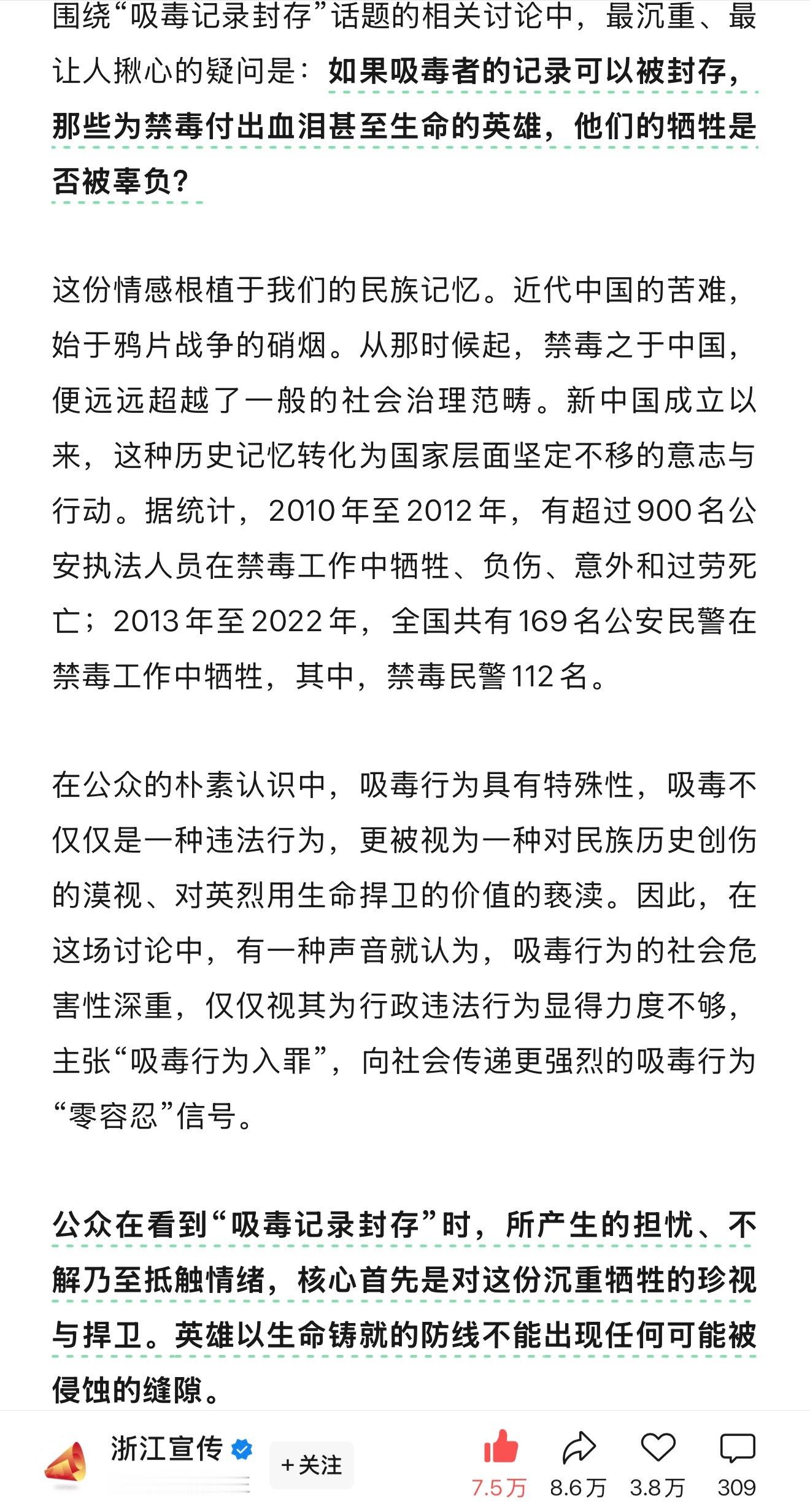 浙江宣传这篇发声已经7.5w的点赞了,刚看完写得非常好。凡涉毒,零容忍!底线不动摇。