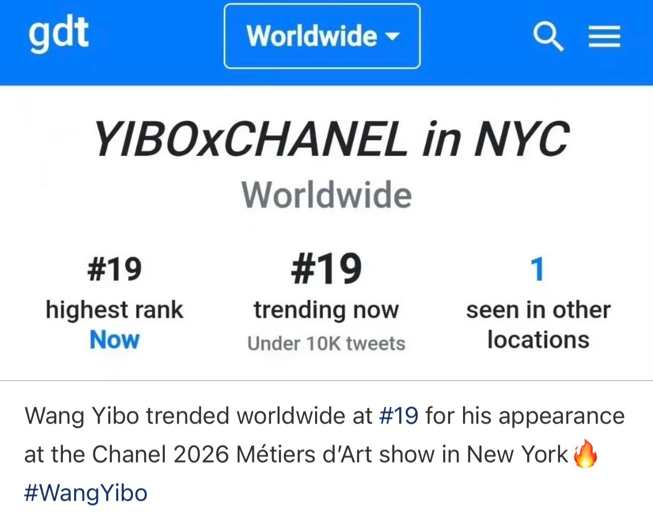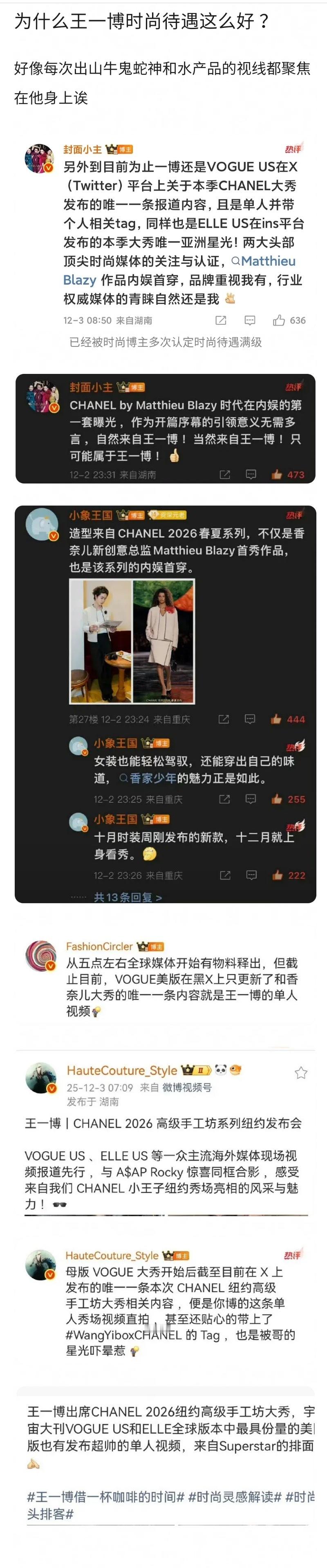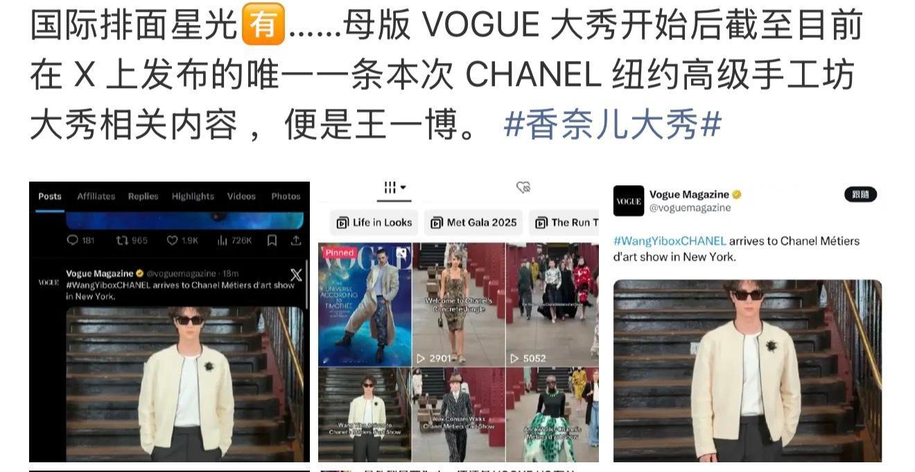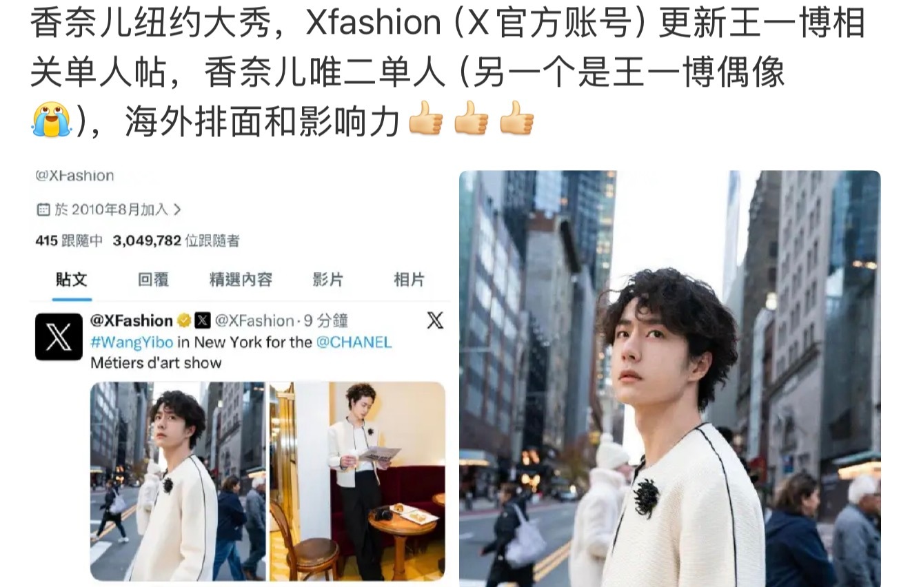 王一博 王一博纽约香奈儿大秀海外星光🔥泰趋第一、世趋19多家权威海外媒体报道,香奈儿官摄、Xfashion和Vogue母版等首位单人