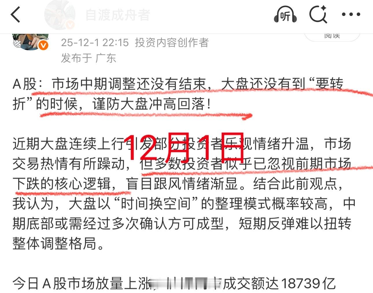 A股老手的忠告:大盘处于中期调整,调整未结束之前,降低操作频次,保持账户的流动性至关重要。事实上,现阶段短线操作的难度已飙升至高位。从11月24日至今,我仅给出过三次明确的短线做多信号,每一次都精准踩中市场节奏:1. 11月25日开盘前,预判当日上涨概率达9成,最终大盘单日上涨33点;2. 11月27日收盘后,提示28日大盘将“先抑后扬”,次日大盘最低下探至3856点,尾盘拉升收于3888.60点,单日上涨13点;3. 12月1日开盘前,再次预判上涨概率9成,大盘当日上涨25点。从实操价值来看,11月28日的抄底信号确定性最高——即便部分股票当日未同步上涨,在后续12月1日的行情中也普遍迎来补涨,盈利性价比拉满。反观12月1日,虽然大盘如期上涨,但如果盘中盲目追高,近两日大概率陷入被动套牢的困境。即便我在12月1日收盘后就提示“谨防大盘冲高回落”,仍有不少投资者未能在12月2日及时减仓避险。截至目前,本周大盘波动空间极度收窄:最高点3914点(12月1日),最低点3869.95点,高低差仅44个点。如此狭小的震荡区间内,想要实现正收益,不仅需要对市场节奏拿捏得极致精准,还得精准选中标的,对投资者的操盘能力要求极高。对于绝大多数普通投资者而言,与其在震荡市中硬拼操作精度,不如选择观望待机——这既是合理的应对策略,更是理性的风险防控。个人观点,仅供交流,不构成投资建议!理财有风险,投资需谨慎!