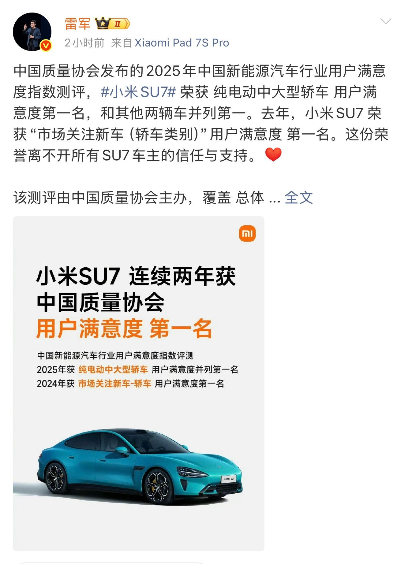 小米SU7能连续两年拿到中国质量协会的用户满意度第一,什么概念,它是顶着“纯电动中大型轿车”这个竞争最激烈的身份拿的,含金量不低。质量协会评测维度,从可靠性、性能设计到售后服务,它都拿了高分。比如我家附近的小米超充站,基本没排过队,充电速度非常快。车机更新也勤,很多车主和网友的小建议,真的在后来的OTA里实现了。网上总有人讨论它是不是网红车,但你看,去年是“市场关注新车”第一,今年直接在同级别用户满意度登顶,口碑是实打实留住了。我自己两辆车用下来,也常跟朋友半开玩笑:这个价位里,想要智能、续航扎实、售后跟得上,SU7还真是绕不开的选项。它或许不是最贵的,但确实是很多人投出来的满意标杆。雷军回应小米SU7再获满意度第一