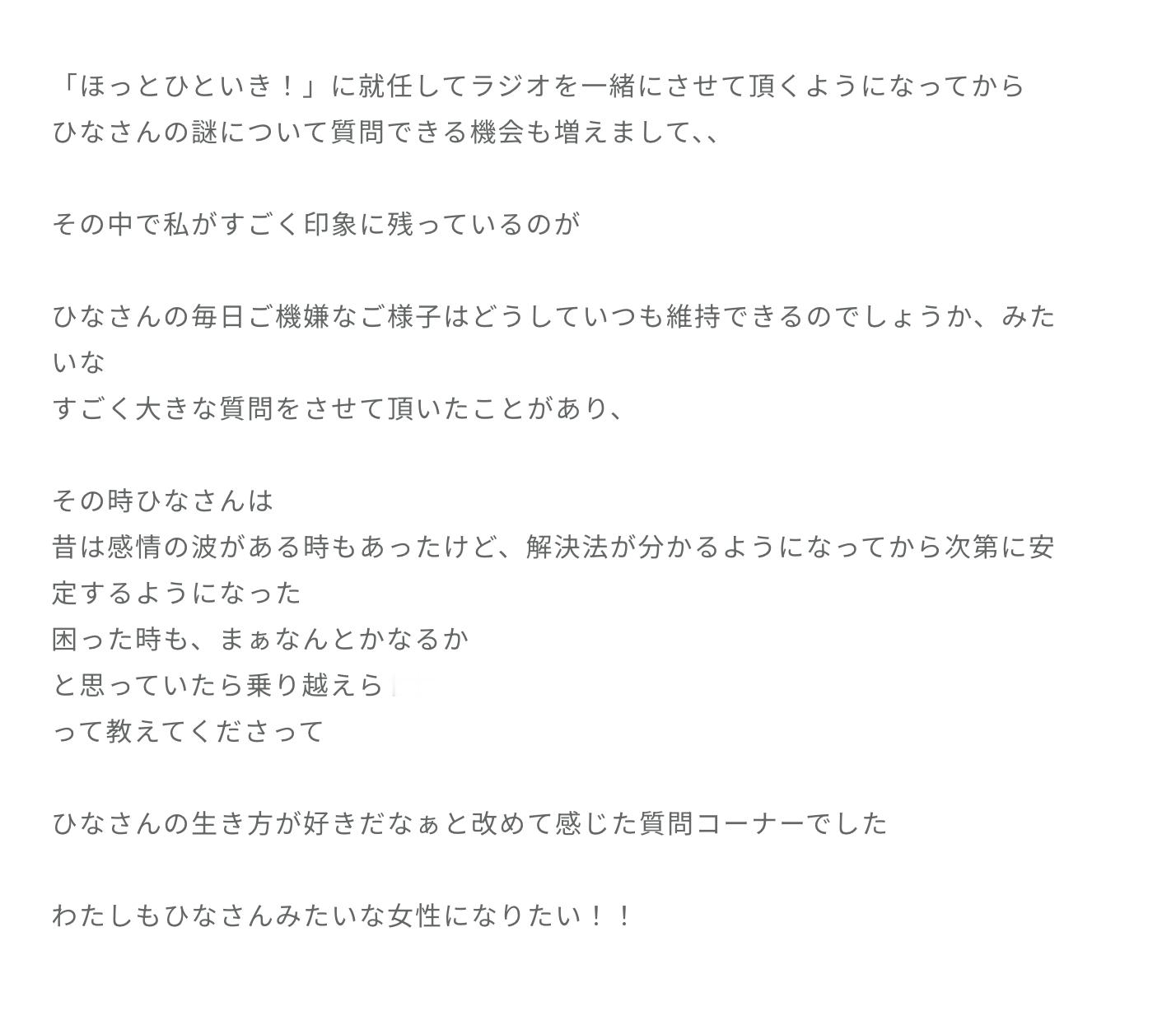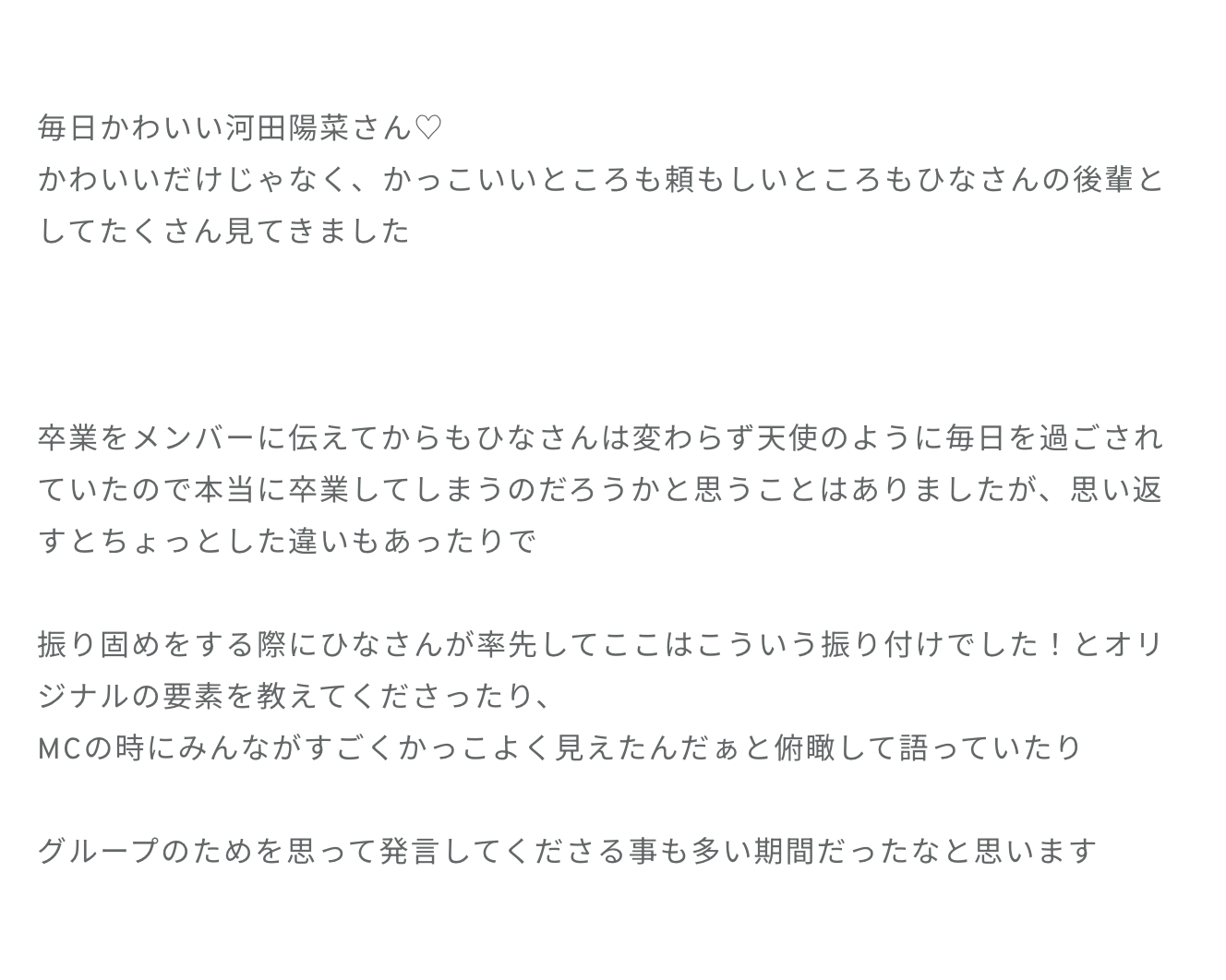 藤嶌果歩「質問コーナー後のひなさん、謎ポーズでかわいい><。いつでもニコニコでみんなに可愛くやさしくて、パフォーマンスになるとかっこよくて、かほりんご先生〜って呼んでくださる唯一無二なひなさんが大好きです。いつまでも、日向坂の癒しです。」