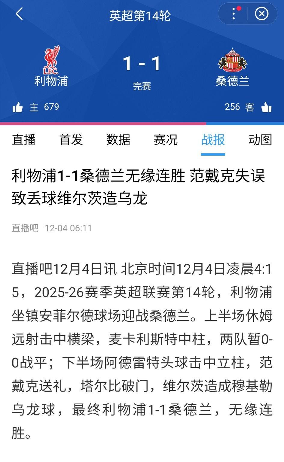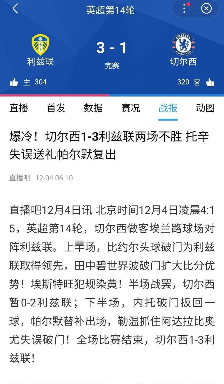 白玫瑰结束三场不胜,英超第14轮3-1击败切尔西,终于逃离降级区。 利兹联近几轮一直深陷降级区,作为上赛季英冠冠军,球队的实力确实不行。保级是本赛季最实际的目标。 利物浦1-1主场险平桑德兰。亿元先生维尔茨依然未能破蛋,算是乌龙球。这场比赛利物浦能打平已经是很幸运了。