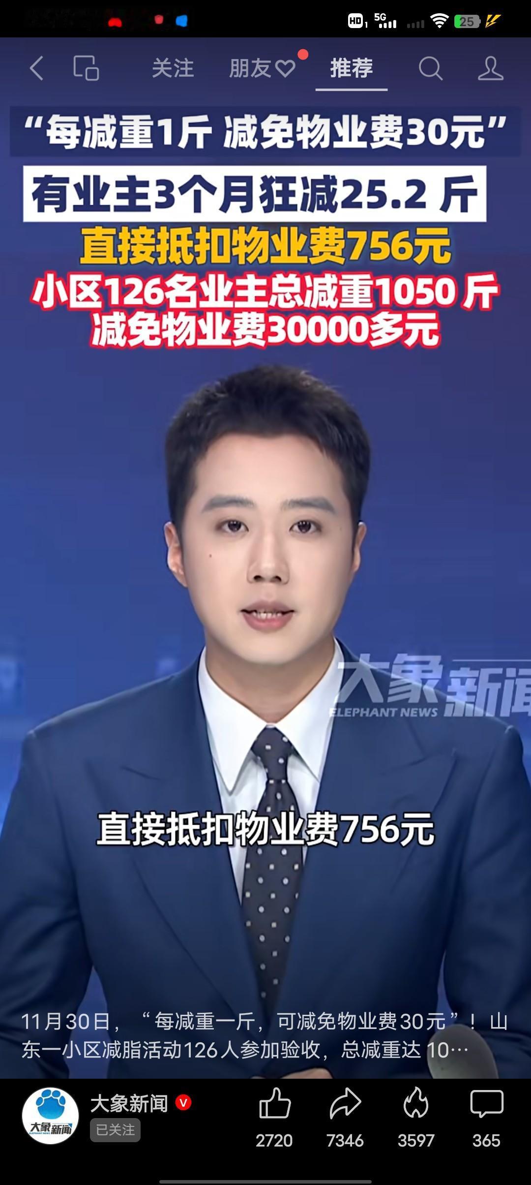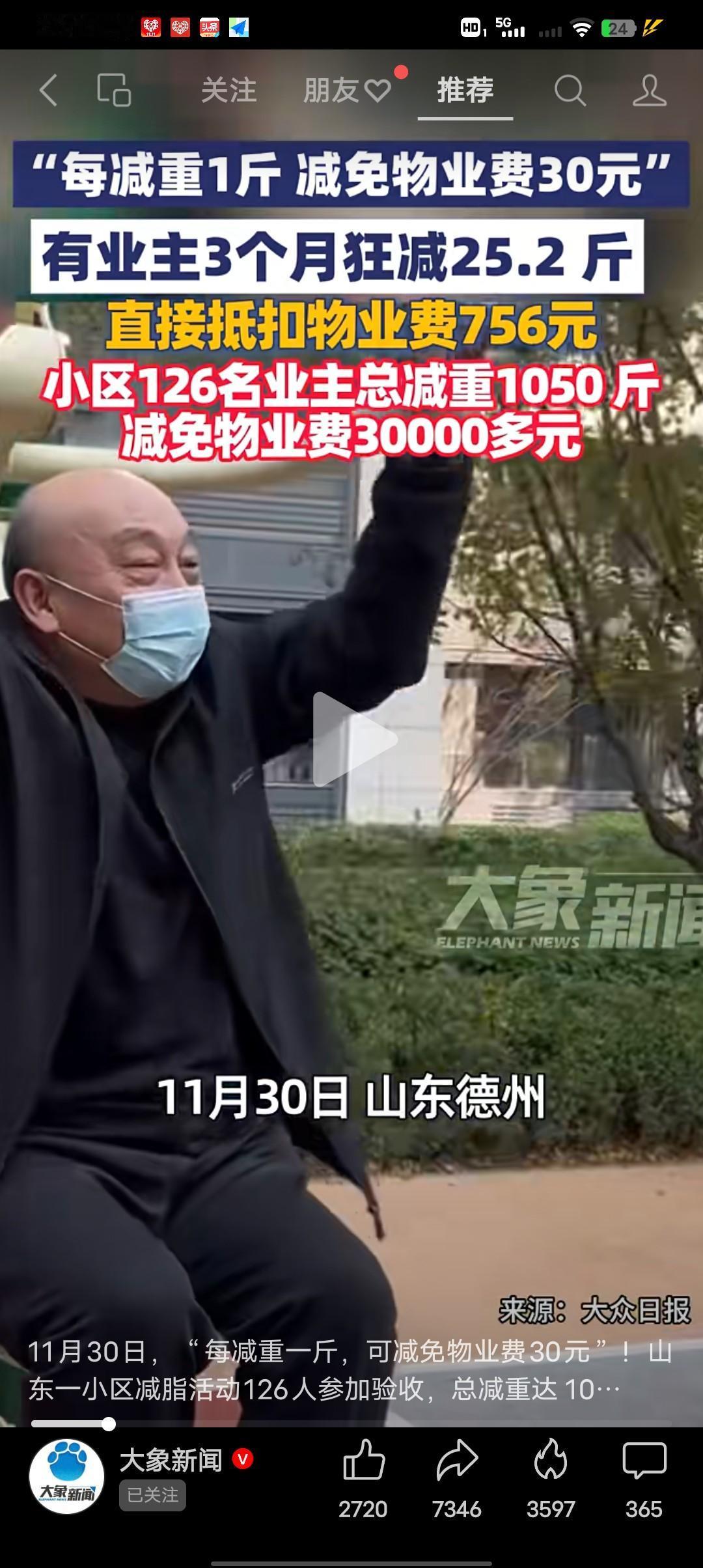 这个活动好,减肥还能减物业费!“每减重一斤减免物业费30元” 11月30日,山东德州某小区减脂活动126人参加验收,总减重达1050斤,减免物业费3万多元。有业主三个月狂减25.2斤,接抵扣物业费756元。 这个活动好,我觉得这个可以推广,这样既能减肥锻炼身体,又能省钱多好啊一举两得,只是好像对瘦的人不太公平,胖的人可以减肥那瘦的呢?怎么减呀? 这也算工益吧,希望可以全全国推广。有网友说这下可以希望全国抄作业了!我还有一个问题,假如全国各地都效仿的话,那么这部分钱用哪个门支出呢?
