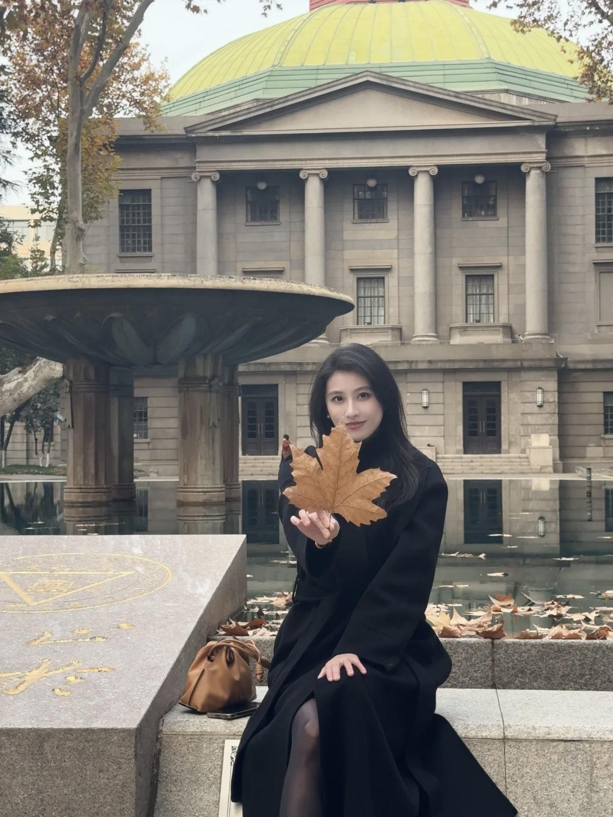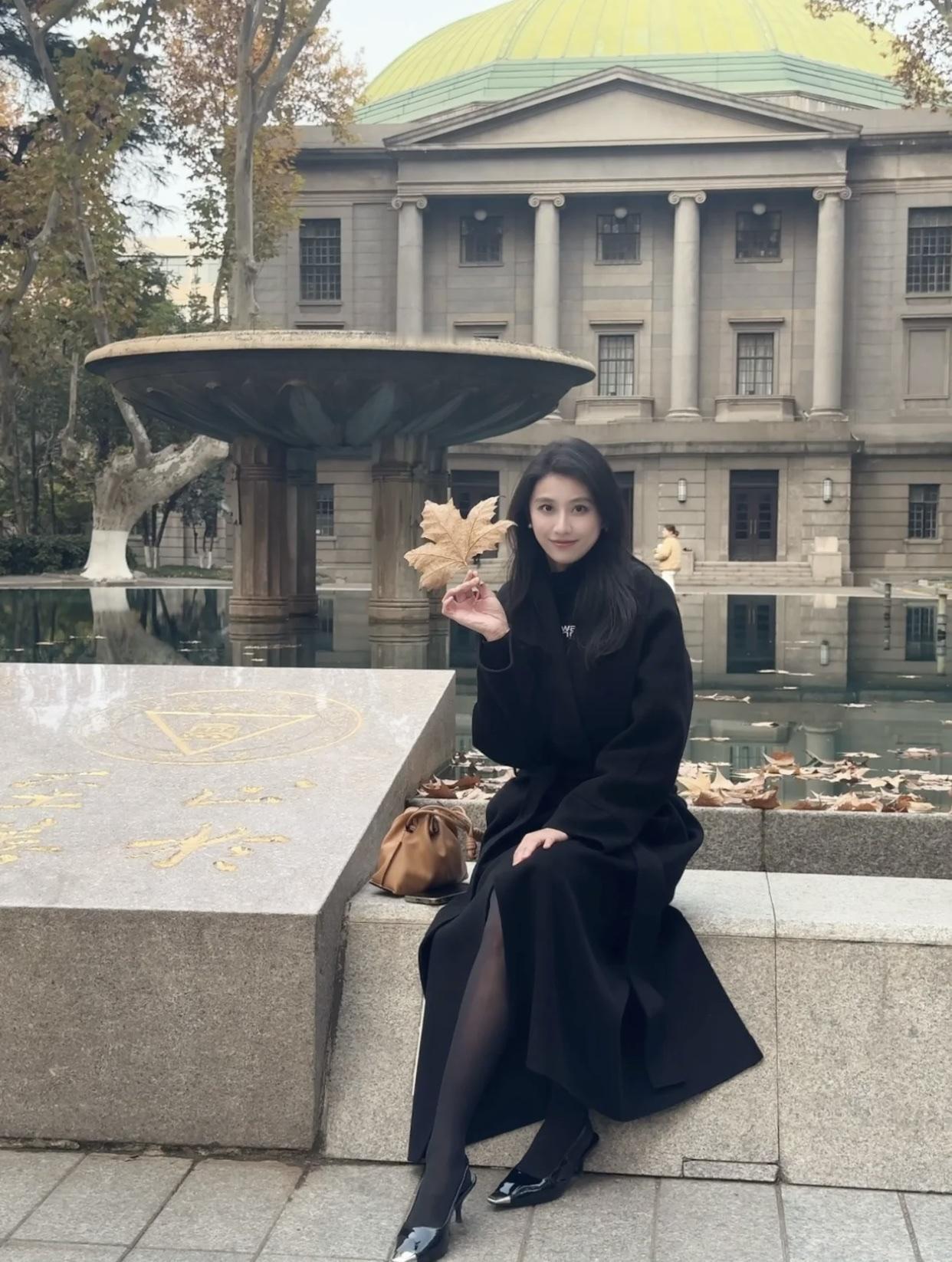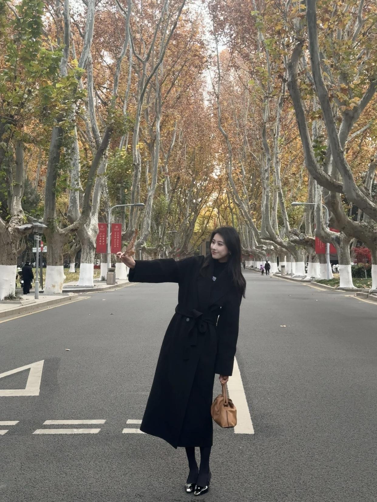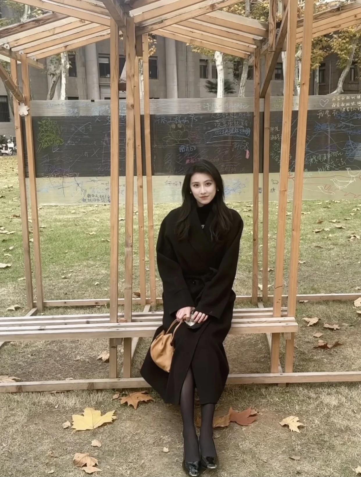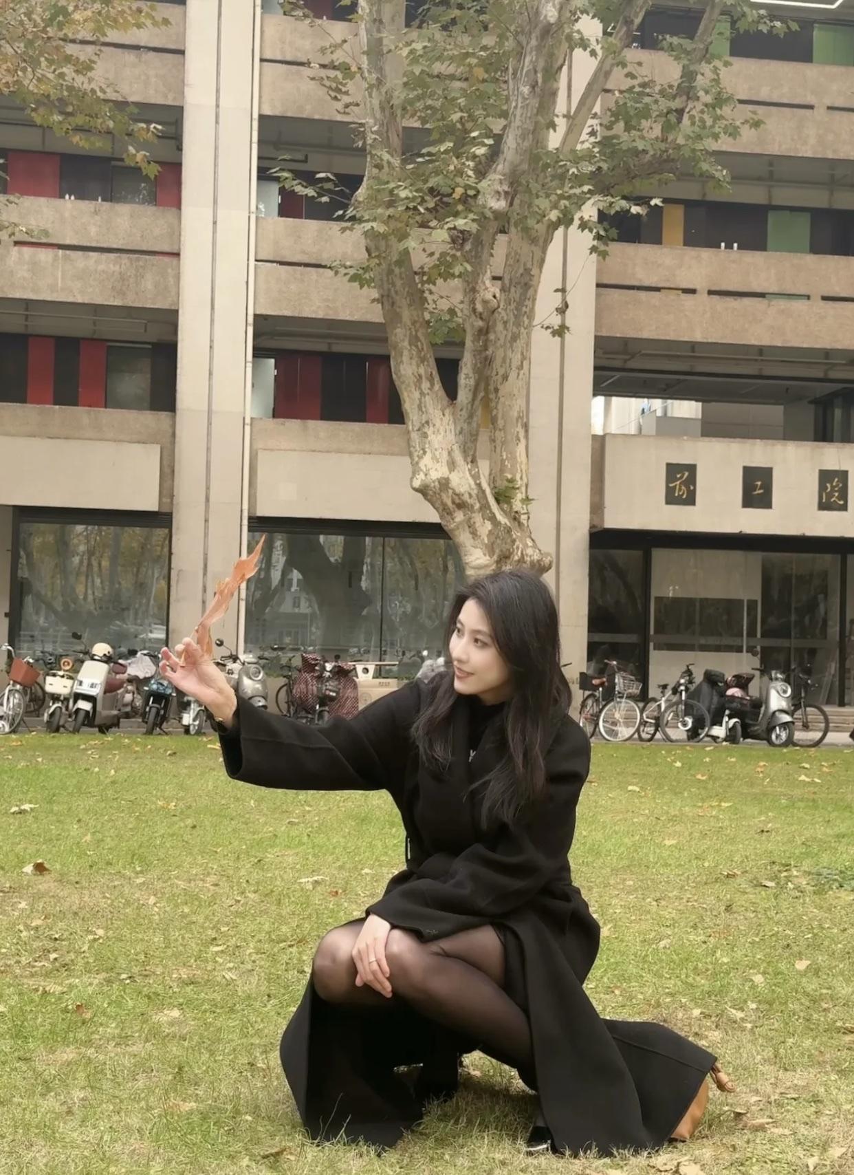 秋日公园里的优雅时光,黑裙与高跟鞋的完美搭配。