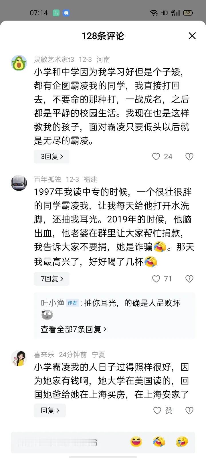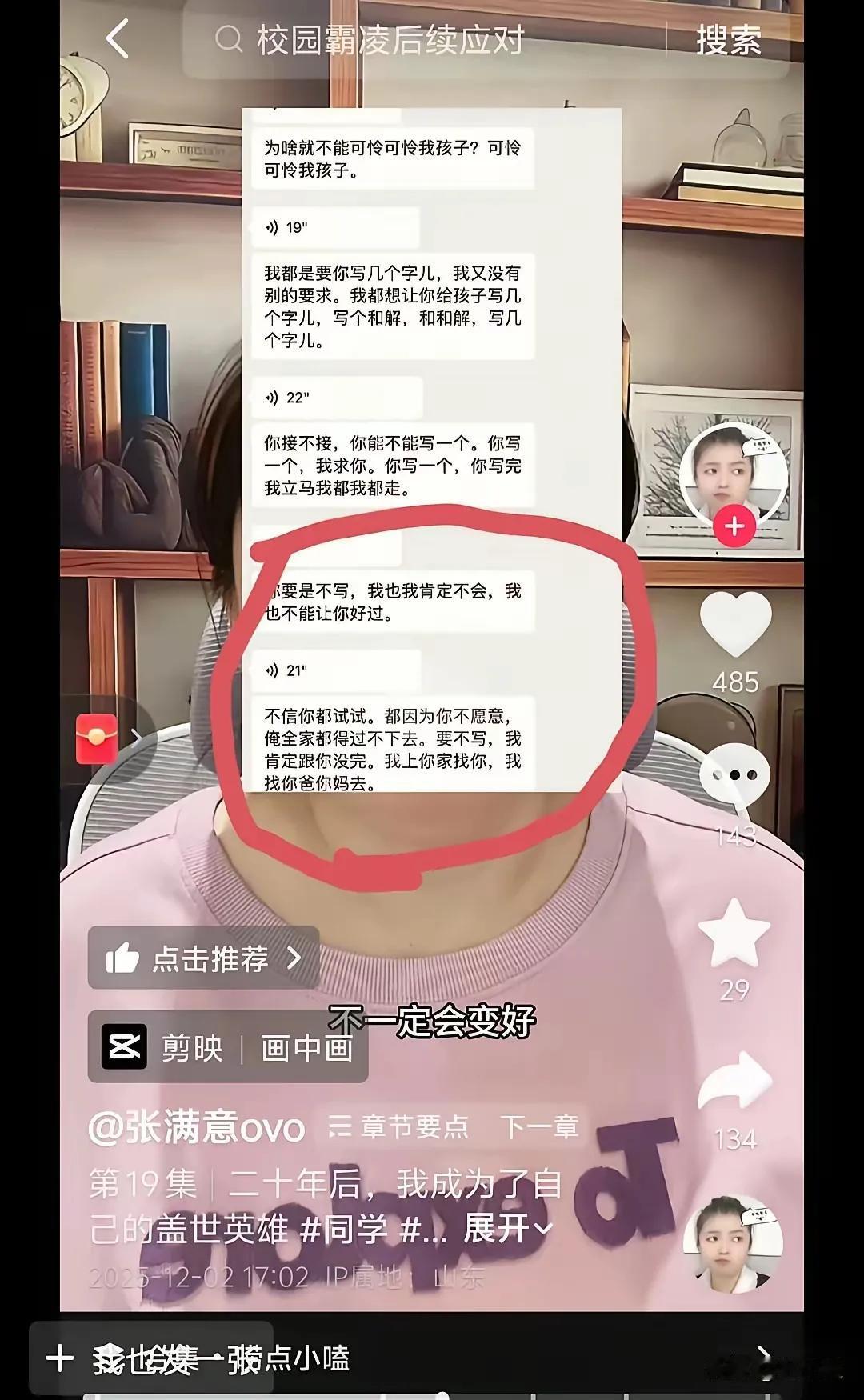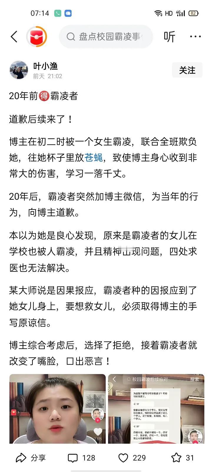 校园霸凌最真实的最快的因果报应来了! 没想到会真的发生的这么快这么准确!二十年前,他往女同学的杯子里放苍蝇。博主胸大,他造谣说是被男人摸大的,导致同学都孤立她。没办法只好转学。但伤害很久远。博主并没有走出来,成绩一落千丈。人生从此换了模样。 后来二十年没联系,有人加她,通过之后说道歉,说需要对方出一份谅解书,拿去还愿。烧掉。说因为有大师指点过他,他女儿现在遇到同样的经历,校园霸凌,而且身心俱疲,起红疹子,抑郁,看了很多地方,都没有好。 一开始低声下气求人家原谅。当知道人家不原谅时口出恶言。让人家等着,不让人家好过。 这个人胆子太大了,既然因果不虚,他怎么敢继续施恶的?他是真不希望自己孩子好起来了啊!恶毒到这种令人发指的地步,世上少见。 真希望报应到他自己身上,所有的痛苦让他自己承担就好了!校园霸凌 未成年人遭霸凌