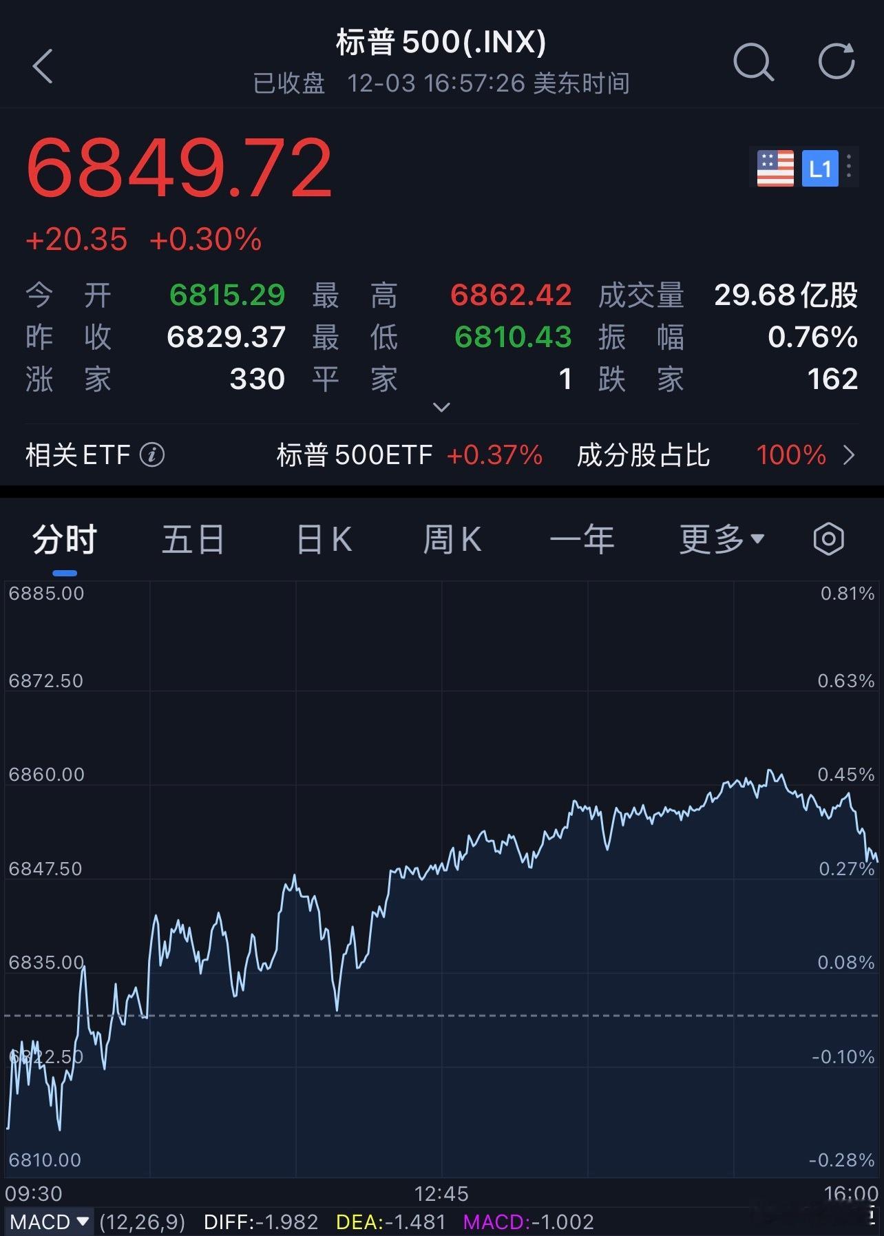 每天早起打卡老板们早安,打卡养铁咯昨夜美股顶着疲软的劳动力市场数据以及微软“AI产品销售疑云”的压力,三大指数低开高走集体收涨,距离历史新高又艰难地迈出了一小步。截至收盘,标普500指数涨0.3%,报6849.72点;纳斯达克综合指数涨0.17%,报23454.09点;道琼斯工业平均指数涨0.86%,报47882.9点。❗️收盘后,标普500指数距离10月29日创出的6920点高位只差71点。同时距离创出收盘新高的点位(6870点)只差21点。中概股多数走弱,纳斯达克中国金龙指数周三收跌1.38%。国际金价走平,白银出现回落。