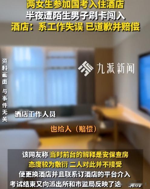 河南济源,有网友在社交平台发文爆料,自己为参加国考,在济源考点附近订了酒店,和同学两个女生入住,半夜十二点半,突然有陌生男性刷房卡打开房门,把二人吓得惊叫。网友称前台解释是安保查房,态度敷衍,她们不接受,随后更换酒店,联系平台介入,考试后还向派出所和市监局反映了情况。 (来源:九派新闻) 11月30号,有俩女生为了参加国考,在济源考点附近订了家酒店。 半夜十二点半,正睡得香,突然房门被刷开了,一个陌生男人闯了进来,把俩女生吓得尖叫连连。 那男人听到叫声,嘟囔着不是说这个房间没人吗,就赶紧走了。 俩女生又惊又怕,这大半夜的,突然闯进个陌生男人,谁能不害怕。 她们赶紧找前台问情况,前台说是安保查房,态度还特别敷衍。 俩女生哪能接受这解释,这酒店也太不靠谱了。 她们当下就决定赶紧换酒店,这地方住着太不安全了。 换了酒店后,她们还联系了订酒店的平台,跟平台反映了这事。 等考完试,她们又向派出所和市监局反映了情况,心里想着一定要讨个说法。 这酒店到底会受到什么处罚呢? 以法律看,酒店的行为,明显侵犯了消费者的安全保障权。 根据消费者权益保护法第七条规定,消费者在购买、使用商品和接受服务时享有人身、财产安全不受损害的权利。 这俩女生在酒店住宿,酒店就有义务保障她们的人身安全。 可半夜陌生男人能刷开房门闯进来,这明显是酒店的安全保障措施不到位,没有尽到应有的安全保障义务。 酒店工作人员误入房间这种解释,根本站不住脚。 就算是工作人员,也不能随意进入客人房间,这是最基本的常识。 酒店没有对工作人员进行有效的管理和约束,导致这种严重侵犯消费者安全的事情发生,必须承担相应的法律责任。 那么,酒店该承担说什么责任呢? 根据消费者权益保护法第四十八条规定,经营者对消费者未尽到安全保障义务,造成消费者损害的,应当承担侵权责任。 酒店的行为给俩女生造成了精神上的惊吓和损害,酒店不仅要对俩女生进行赔偿,还要接受相关部门的处罚。 市监局应对酒店进行批评教育并要求整改,这就是在行使监管职责,督促酒店改正错误,保障消费者的合法权益。 酒店主动联系俩女生赔偿,这也是应该的。 这是酒店认识到自己错误后,积极采取的补救措施。 如果酒店不主动赔偿,俩女生还可以通过法律途径,要求酒店承担侵权赔偿责任,包括精神损害赔偿等。 在外住宿时,一定要选择正规、信誉好的酒店。 入住后,要检查房间的安全设施是否完好,如门锁、窗户等。 如果发现安全问题,要及时与酒店沟通解决。 最终,市监局批评教育了酒店,要求整改,酒店也主动联系俩女生赔偿了。 酒店解释是工作人员处理别的房间问题误入了,已向当事人道歉赔偿。