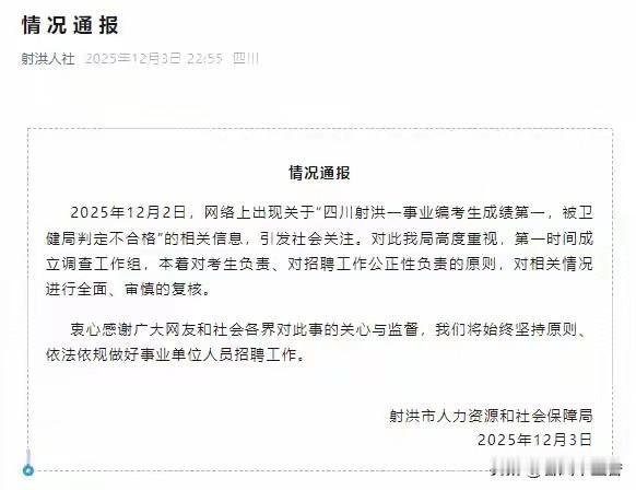 12月2日,“四川射洪一事业编考生成绩第一,被卫健局判定不合格”的消息引发热议。据了解,有网友在“问政四川”留言,自己医疗岗位综合成绩第一,政审却被卫健局以“学历套读”“中专与成人大专学历时间重叠”判定违规。可射洪市教育招生考试委员会办公室证明其符合报考条件,且报考时如实提交材料,笔试、面试学历审核都通过了。 12月3日晚,射洪市人社局发布通报,成立调查工作组全面复核。希望能尽快查明真相,给考生和大众一个公正的结果。
