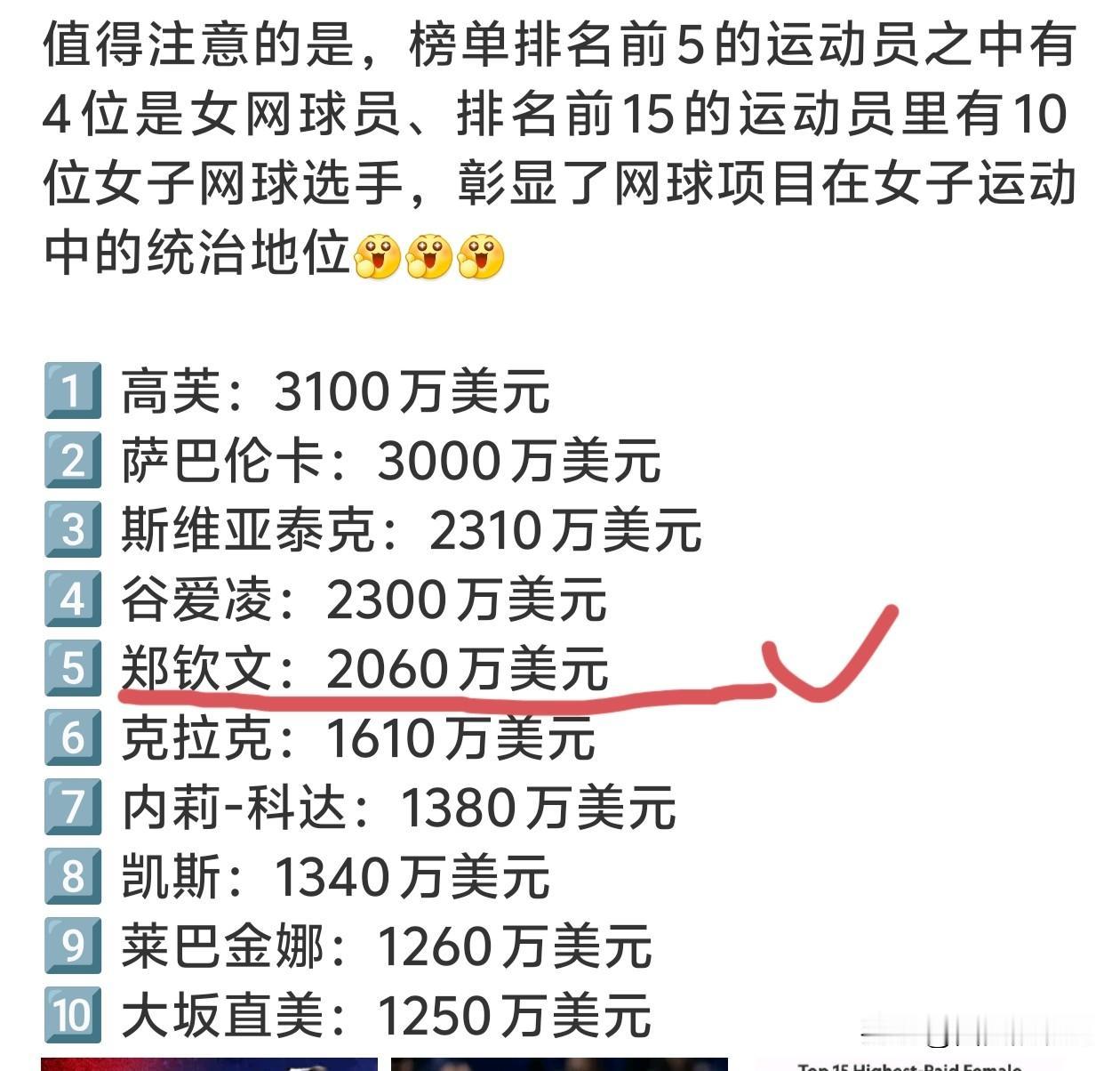 这年收入高,是真的高啊[捂脸],郑钦文位列榜单第五 原来财经媒体《Sportico》发布了2025年女子运动员收入榜单,前五位有80%都是网球运动员。 而朱婷的年薪在女排也算是顶薪了,都排不到榜单前十。 难怪难么多人都说网球是贵族运动,虽费钱又耗人人,但收入确实是高啊。郑钦文