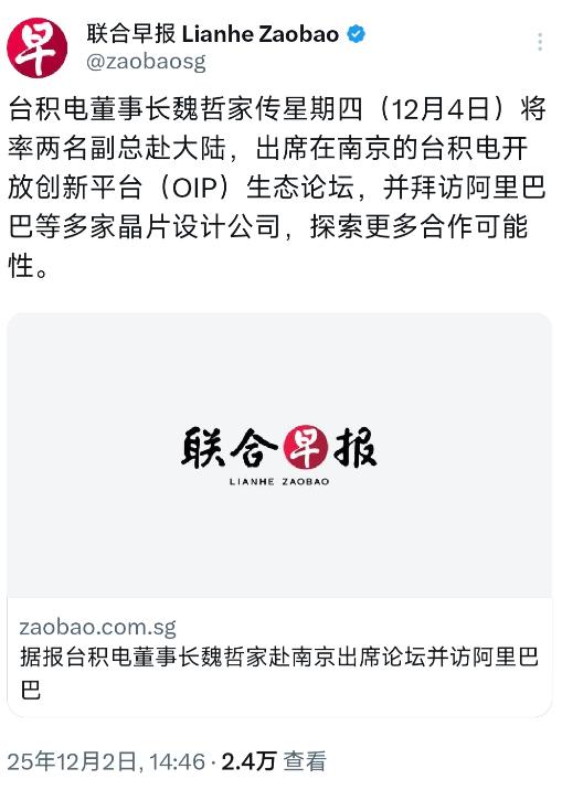 新加坡联合早报12月2日报道:“台积电董事长魏哲家传星期四(12月4日)将率两名副总赴大陆,出席在南京的台积电开放创新平台(OIP)生态论坛,并拜访阿里巴巴等多家晶片设计公司,探索更多合作可能性。” 今年的OIP论坛从9月就从硅谷开启了全球巡回路演,先后走过东京、新竹、阿姆斯特丹,最终把收官之站选在南京,这种安排本身就释放出强烈的信号,南京作为中国半导体产业的重要基地,在台积电全球战略中的分量可见一斑。 论坛的议题紧紧扣住了当下科技圈最火的人工智能,参会者们会聚焦下一代AI芯片的能源效率挑战,还有A16、N2和N3这些先进制程的设计流程解决方案,这些技术点每一个都关乎未来芯片产业的走向。 要知道现在大陆市场在智能手机、物联网、边缘计算和汽车应用领域的AI需求正呈爆发式增长,台积电把全球巡回路演的最后一站放在这里,显然是想近距离捕捉这些市场需求的脉搏。 除了论坛活动,魏哲家团队还计划拜访阿里巴巴等多家大陆本土芯片设计公司,其中与阿里的互动尤其引人关注。阿里巴巴旗下的平头哥半导体早已推出多款AI和服务器芯片,而台积电一直是阿里高端芯片的主要代工合作伙伴。 双方这次高层会晤,极有可能涉及下一代AI芯片的合作规划,特别是在台积电N2、N3等先进节点上的设计协同与产能安排,毕竟在人工智能成为全球科技竞争焦点的当下,阿里对高性能、低功耗AI芯片的需求只会越来越旺盛。 更值得琢磨的是,这次访问发生在美国对中国芯片封锁尚未完全解除的背景下,这种微妙的时机让整个行程充满了战略试探的意味。台积电需要在遵守美国出口管制的同时,维持并拓展在中国市场的业务,这本身就是一道高难度的平衡题。 目前台积电在大陆的业务主要集中在28纳米成熟制程,而大陆本土企业在该工艺上已经实现了成熟量产,业内不少人推测魏哲家此行意在探索深化合作的可能性,甚至不排除推动新建厂计划的讨论。 如果新建厂计划能够落地,依托大陆相对优势的人力与能源成本,台积电或许能在成熟制程领域进一步扩大市场份额,但这也可能对大陆本土中低端芯片产业形成一定的竞争压力,这种合作与竞争并存的局面,正是当前半导体产业格局的真实写照。 回顾魏哲家上一次赴陆,还是2023年出席上海技术论坛,这次时隔两年半的再次亲征,足见台积电对大陆市场的重视程度。2025年大陆芯片需求量预计高达1000亿至2000亿颗,这样庞大的市场体量,任何一家半导体企业都无法轻易忽视。 台积电作为全球半导体产业的龙头企业,它的每一步战略调整都牵动着整个产业链的神经。这次南京之行,表面上是参加技术论坛和商务拜访,实质上是台积电在全球半导体变局中寻求战略平衡点的一次重要尝试。 可能的合作方向并不局限于芯片制造本身,还可能延伸到更广泛的生态整合,比如针对边缘计算、物联网等场景的定制化芯片解决方案,这种深度的生态合作,既能让台积电巩固在产业链中的核心地位,也能帮助大陆企业更快地接触到全球最先进的半导体技术。 当然,台积电也需要谨慎评估地缘政治风险,确保业务拓展不会触发监管红线。在美国大选后政策走向尚未完全明朗的背景下,这种平衡显得尤为重要,毕竟稍有不慎就可能陷入进退两难的境地。 魏哲家带领团队走进南京的会场,与大陆芯片企业的负责人握手交谈时,他们谈论的不仅是技术参数和合作细节,更是全球半导体产业在技术民族主义与全球化力量拉锯下的未来走向。 这次访问的影响或许不会立刻显现,但它无疑为观察中美科技竞争下半导体产业的发展提供了一个重要窗口,而台积电在大陆市场的每一个动作,都将成为书写这个行业新篇章的关键一笔。