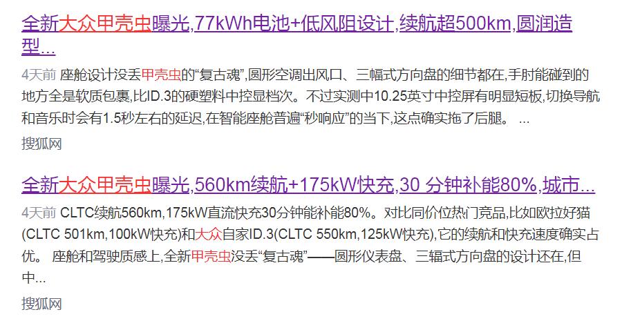 大众的经典车型甲壳虫也要出新能源款了! 560km续航,30分钟补能80%! 和自家ID.3(CLTC 550km,125kW快充)相比, 它的续航和快充速度妥妥的占据优势! 现在新能源车的配置都比较卷, 新出的车型都会把新技术用满, 配置肯定不用担心! 就是网爆出来的外观图,差那么点意思! 本来挺圆润可爱的外观,前面过个进气口加大众标! 感觉少了甲壳虫本来的灵气! 附了两张经典车型的外观图,大家比较看看! 其实大众只要不动外观,稍微提升下内饰档次! 就这外观,在目前一众看起来差不多的新能源小车中,还是很能打的! 价格嘛?比自家ID3贵2万左右就可以了! 懂车帝车友圈大众甲壳虫大众id3和比亚迪海豚哪个好新能源车该有的样子 新手上路,定期更新! 劳烦关注,一定回关!