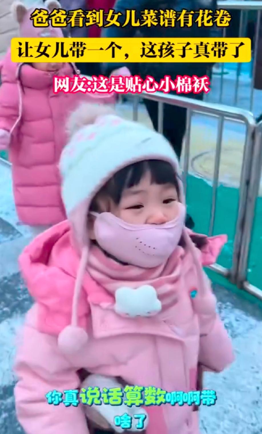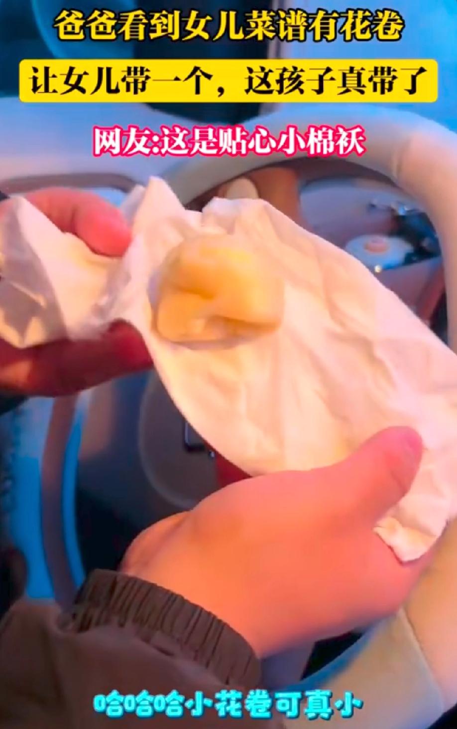 小棉袄好暖心啊!幸福感爆棚! 黑龙江一爸爸跟女儿说想吃幼儿园的小花卷,去接的时候,没想到女儿真的带出来一个。小小的花卷,用纸巾包着。老父亲吃着花卷流下了欣慰的眼泪,感动不已! 花卷虽小,却承载着女儿对爸爸的爱。可见她爸没白疼她,从小就知道疼爸爸,真是贴心又孝顺,还诚信,说话算数! 这就是养孩子的意义!接过花卷,之前再累再苦都值得了。