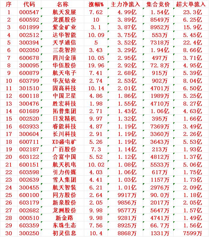 12月4日开盘45分钟,主力资金“买入的 ”的30名单一览! 航天发展:净流入 4.99亿元 龙溪股份:净流入 3.89亿元 紫金矿业:净流入 3.87亿元 达华智能:净流入 3.75亿元 天孚通信:净流入 3.52亿元