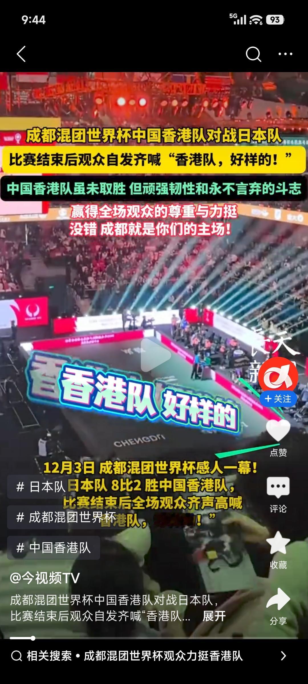 在成都混团世界杯的赛场上,中国香港队的表现太圈粉了!2023年12月2日晚,中国香港队在与埃及队的生死战中成功晋级八强。尽管国乒比赛结束,现场观众仍全力支持。陈灏桦与朱成竹混双首战以2比1拿下两分,杜凯琹更是三局击败埃及明星选手汉娜·高达。 还有对战日本队比赛结束后,观众自发齐喊“香港队,好样的!”这种热情太让人感动。杜凯琹也说现场球迷助威是胜利重要因素,感觉像在主场。大家对香港队的支持,就是体育精神最好的体现。