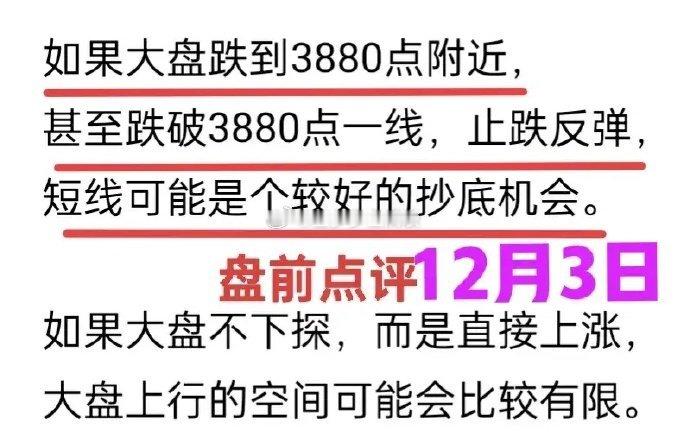 A股:大盘连续阴跌两天,似乎又到了短线抄底时刻,3860~3850点区域是短线重要支撑带。首先,金姐还是要明确一点,大盘中期调整还没有结束。无论是短线操作还是中线操作,把这个作为前提会更从容一些。金姐昨天的盘前观点:大盘跌到3880点,甚至跌破3880点,才可能有较好的反弹机会。昨天下午大盘最低3869点,跌破了3880点,但分时成交量没有放大,让金姐对市场反弹产生了一丝疑虑。目前上证综指跌破了短期均线,而且昨天市场的成交金额比前一天放大了,是放量跌破均线。从这个角度来说,日线级别不太好看。分时级别,目前大盘还没有跌破3850点。之所以提到3850点,是因为11月25日的时候,大盘有个向上跳空缺口,这个缺口的下沿就在3850点一线。11月28日的时候,大盘最低跌到了3856点,没有回补11月25日的缺口。也就是说,在3850~3860点区域被有效跌破之前,并不能完全确认大盘就要Over了。另外,11月30日(上周末)的时候,牛哥说了,由于市场整体成交量缩小,而且大盘处在一个上有压力下有支撑的局面,本周大盘大跌或大涨的概率都不大。预计今天大盘有效跌破3860~3850点区域的概率较低。如果大盘跌进了这个区域,有可能出现较好的短线反弹机会。对于普通投资者来说,现在难的是选择股票。因为目前市场整体还是震荡格局,今天收阳了,第二天可能就收阴,个股上涨的持续性较差。对于可能的短线机会,有把握就做,没把握不强迫自己交易。个人观点,仅供交流,不构成投资建议!理财有风险,投资需谨慎!大盘行情大盘分析行情A股行情