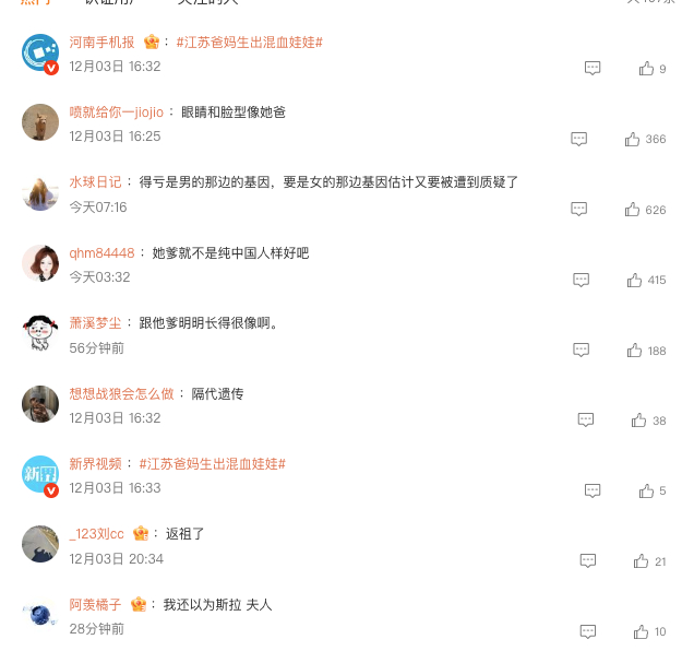 江苏爸妈生出混血娃娃人家爹本身就是混血,太爷爷是斯拉夫人,是欧洲人的代表民族之一。说什么得亏是男的那边的基因,要是女的那边基因估计又要被遭到质疑了,这不就是典型的搞男女性别对立吗?