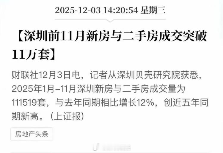 深圳前11月新房+二手房成交破11万套,增长了12%。量可以,就是价得明年再涨了。深圳