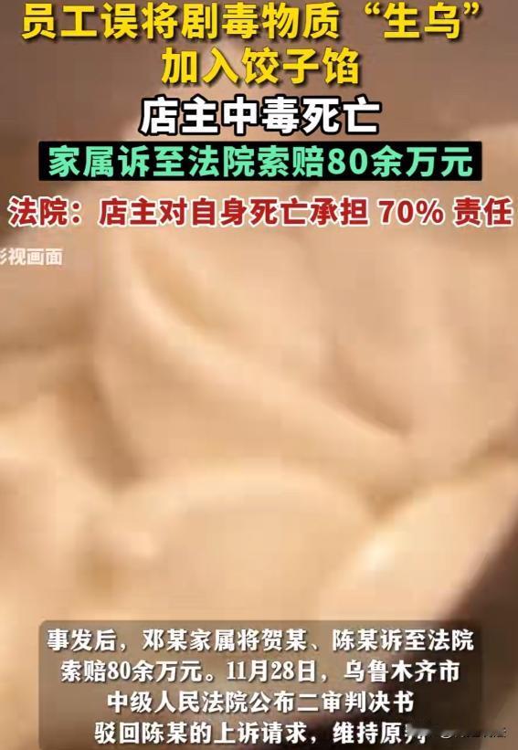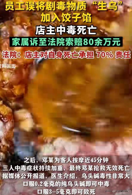 新疆乌鲁木齐,一男子在冬至请师父吃饺子,技师包了200多个,煮了90多个供3人食用。不久后3人出现中毒症状,询问得知技师误将剧毒生乌粉末当黑胡椒调进饺子馅。师父提议喝姜汤缓解一下,男子喝完继续工作,45分钟后3人症状未缓解才拨打120。男子经抢救无效离世,家属将师父和技师起诉索赔80万,最终被左右处理。 2023年冬至,对乌鲁木齐的邓某家属来说,是痛苦的一天。 邓某开了推拿店,每周请专业医师师父陈某来指导坐诊。 每年冬至,他都会请师父吃饺子。 这天,他买好食材让技师小贺包饺子,自己则去接师父。 小贺在推拿店当技师有些年头了,平时干活挺利索。 这天接到邓某安排包饺子的活儿,她也没多想,就开始动手。 她手脚麻利,2小时就包了200多个饺子,还煮好90多个。 邓某把师父陈某接回来,3人饿坏了,围坐在桌前,没一会就把煮好的饺子吃了个精光。 可这顿饺子吃完没多久,意外就来了。 邓某最先感觉不对劲,肚子开始隐隐作痛,紧接着恶心想吐,脑袋也晕乎乎的。 他赶紧问小贺,是不是饺子馅里放了啥不该放的东西。 小贺这才想起来,自己包饺子的时候,误把生乌粉末当成黑胡椒,放了4勺在馅里。 陈某在旁边一听,觉得自己有经验,毕竟自己是有医师资格的。 他提议大家喝姜汤解毒,说姜汤能驱寒,说不定能把这毒给解了。 邓某当时也没多想,觉得师父是专业医师,说的话肯定靠谱,喝完姜汤就去给预约的顾客按摩了。 他想着赶紧把顾客服务完,说不定身体就好了。 可按摩的时候,他就感觉症状越来越严重,肚子痛得像刀绞一样,恶心感也愈发强烈,脑袋更是晕得站都站不稳。 他回头一看,师父陈某和小贺也脸色苍白,捂着肚子直哼哼。 这时候,邓某才意识到事情的严重性,赶紧掏出手机拨打了120。 可一切都晚了,等急救人员赶到,邓某已经陷入了昏迷状态。 尽管医护人员全力抢救,最终还是没能把他从死神手里抢回来,邓某抢救无效而离世。 邓某这一走,家里可就塌了天。 他的父母年纪大了,身体也不好,平时就靠他照顾。 妻子没工作,孩子还小,一家人全指望他开推拿店的那点收入过日子。 现在他突然没了,这个家以后可怎么办? 邓某家属悲痛欲绝,他们觉得这事不能就这么算了。 小贺作为包饺子的人,没谨慎注意,误把生乌粉末当成黑胡椒,这才导致邓某中毒身亡,她得负责。 陈某作为有医师资格的人,在邓某中毒后,没有采取正确的救治措施,反而用偏方让邓某喝姜汤,还让他去按摩,加速了毒性扩散,他也得担责。 于是,邓某家属一纸诉状,把小贺和陈某告上了法庭,要求他们赔偿死亡赔偿金、丧葬费、被扶养人生活费等各项费用共计80万。 这责任到底该如何划分,难道真就如家属所想的那样吗? 根据民法典第一千一百六十五条规定,行为人因过错侵害他人民事权益造成损害的,应当承担侵权责任。 小贺在包饺子时,没有仔细辨别食材,误把生乌粉末当成黑胡椒放进馅里,导致邓某中毒身亡,她存在明显的过错,应当承担相应的赔偿责任。 陈某作为有医师资格的专业人员,在邓某中毒后,本应该凭借自己的专业知识和经验,采取正确的救治措施。 可他却用偏方让邓某喝姜汤解毒,还让他去按摩,这种行为不仅没有起到救治作用,反而加速了毒性扩散,对邓某的死亡存在一定的过错,也应当承担一定的赔偿责任。 而邓某自己,作为完全民事行为能力人,在购买食材时,没有把生乌粉末和调料分开放置,导致小贺误用。 中毒后,他又轻信陈某的偏方,喝完姜汤还去按摩,加速了毒性扩散,对自己中毒死亡的结果也存在一定的过错。 根据民法典第一千一百七十三条规定,被侵权人对同一损害的发生或者扩大有过错的,可以减轻侵权人的责任。 所以,邓某自己也要承担一部分责任。 总觉得意外不会降临到自己头上,对一些潜在的危险掉以轻心。 就像邓某,如果他能提前把生乌粉末和调料分开放好,或者中毒后及时拨打120,而不是轻信偏方,也许这场悲剧就不会发生。 在遇到突发情况时,要保持冷静,不要盲目相信一些没有科学依据的偏方,要及时寻求专业人员的帮助。 最终一审法院判决,小贺支付邓某家属死亡赔偿金等245629.37元,陈某支付122814.69元。陈某上诉,二审维持原判。 生命是脆弱的,容不得半点马虎。 在生活中要时刻保持警惕,做好安全防范措施,遇到问题要相信科学,依靠专业力量解决。