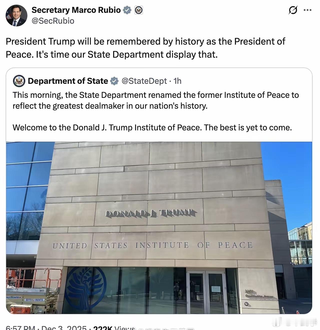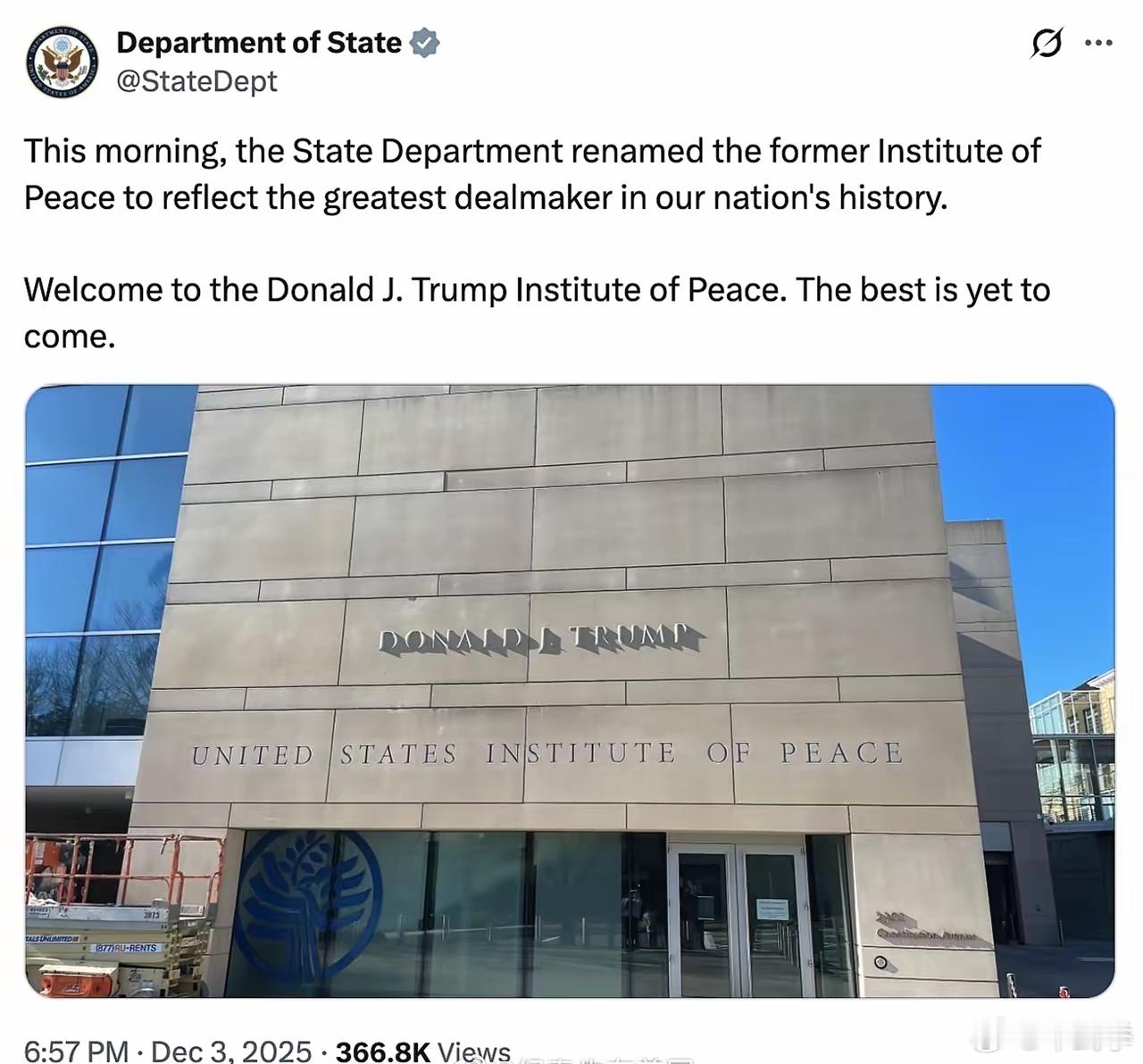 为纪念美国历史上“最会达成交易的人”,美国国务院刚刚把“和平研究所”的名字改成了“唐纳德·J·川普和平研究所”。