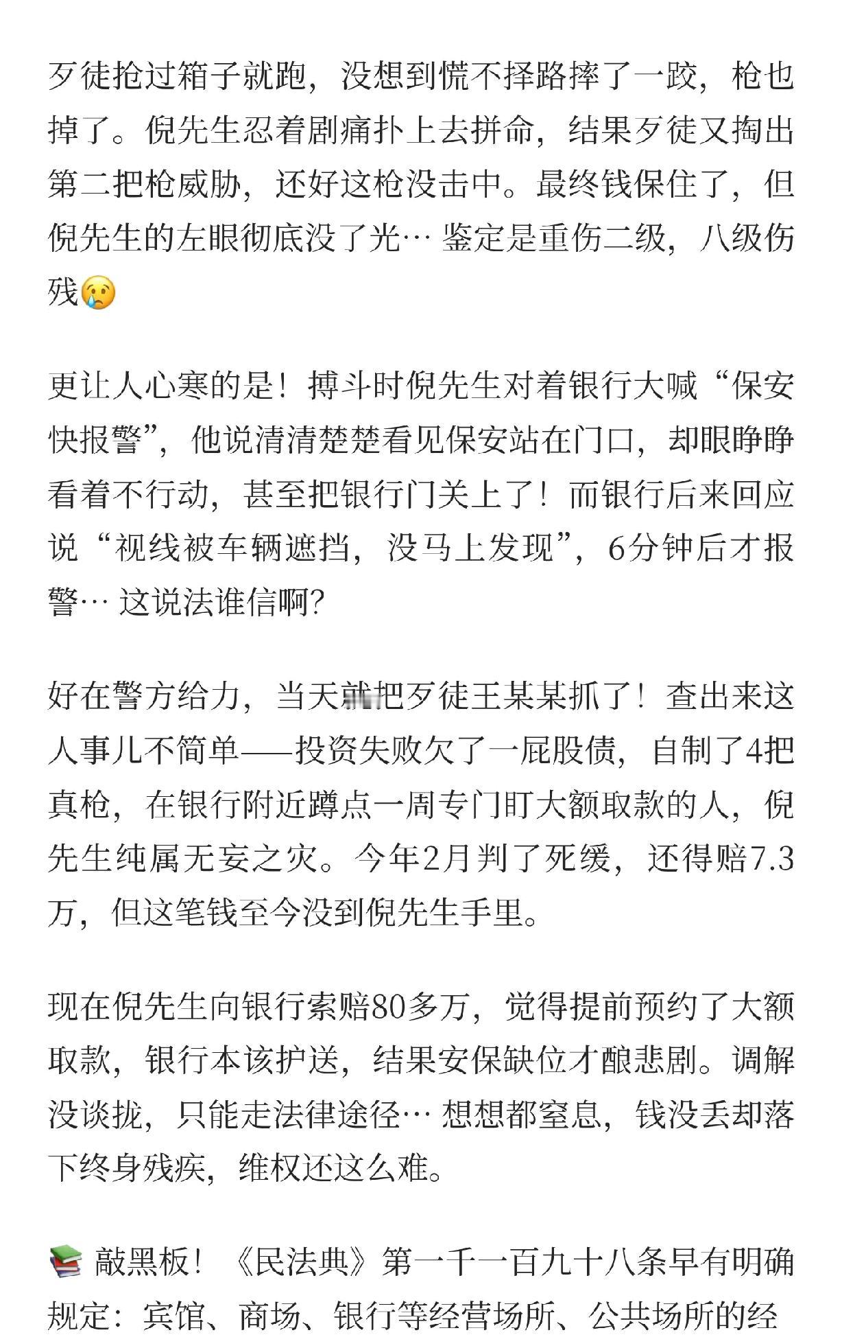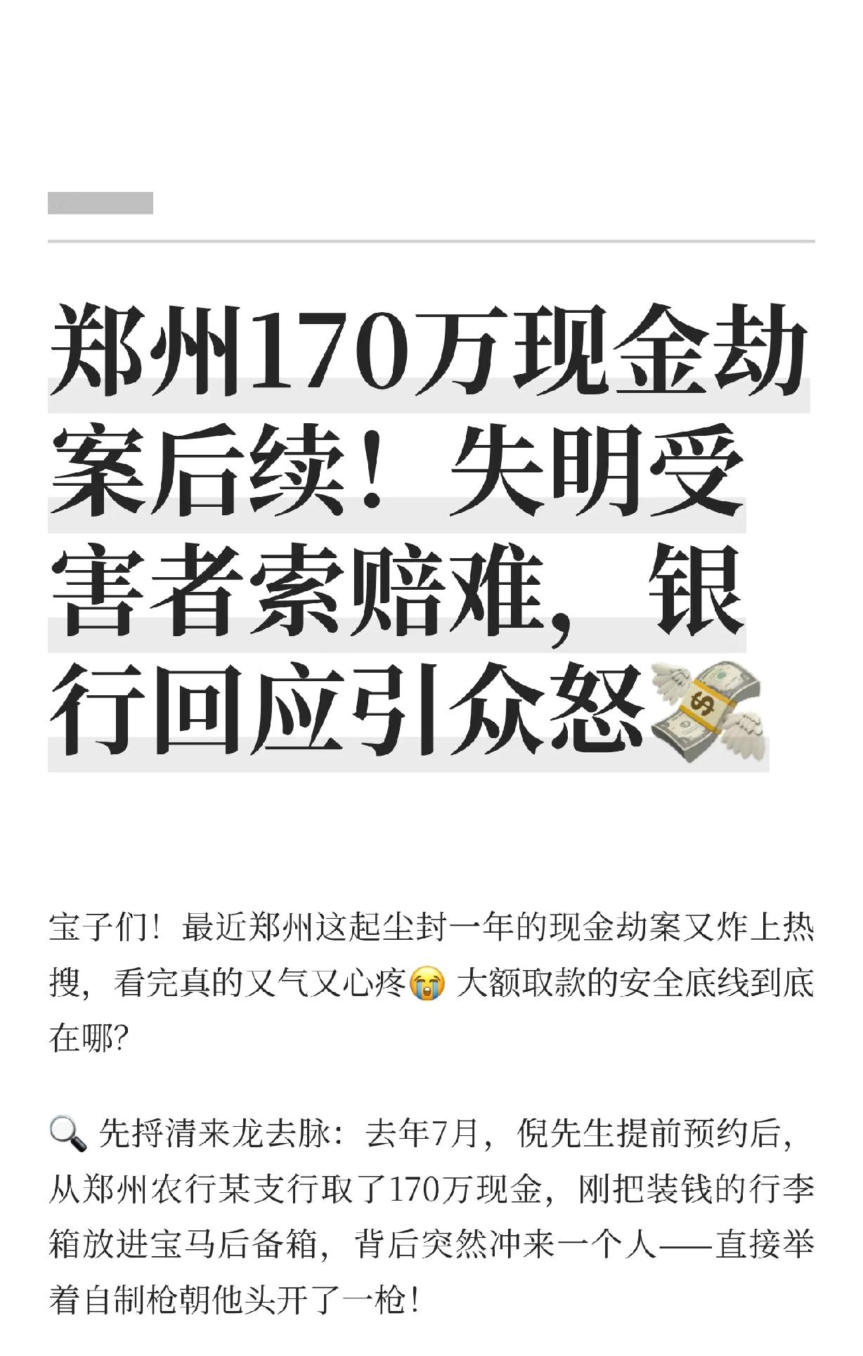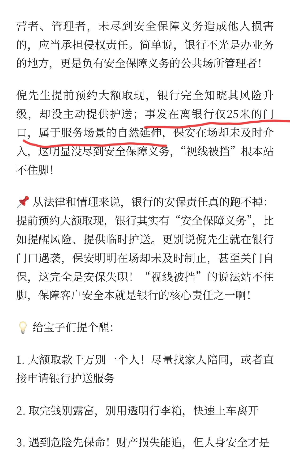 郑州170万现金劫案后续,受害者要求银行承担责任,索赔80万,大家怎么看? 说实话,我开始也觉得可以索赔,毕竟在银行门口,不过当我看到离银行25米的时候,我沉默了。 大街上,25米很远的距离了吧?这还属于银行的责任区吗?保安即便没看到也是正常的。 虽然银行有钱,170万对他们也是小数,但也不能随便赔吧?