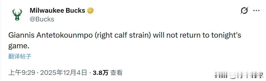 不甘心啊!字母哥无对抗受伤! 今天雄鹿主场与活塞的对决,首节9分钟,字母哥在行进过程中无对抗突然倒地,随后用手捂着自己的跟腱部位,这一幕让人揪心,他自己也流露出不甘心的表情,连连摇头表示无奈,随后直接返回了更衣室接受检查和治疗。 几分钟后,雄鹿队官方宣布,字母哥因右小腿拉伤,本场比赛不会回归。字母哥不是跟腱问题已是非常幸运的事情,不过他肯定会缺席部分比赛,届时雄鹿会打出怎样的表现,将决定球队的运作和字母哥的选择!