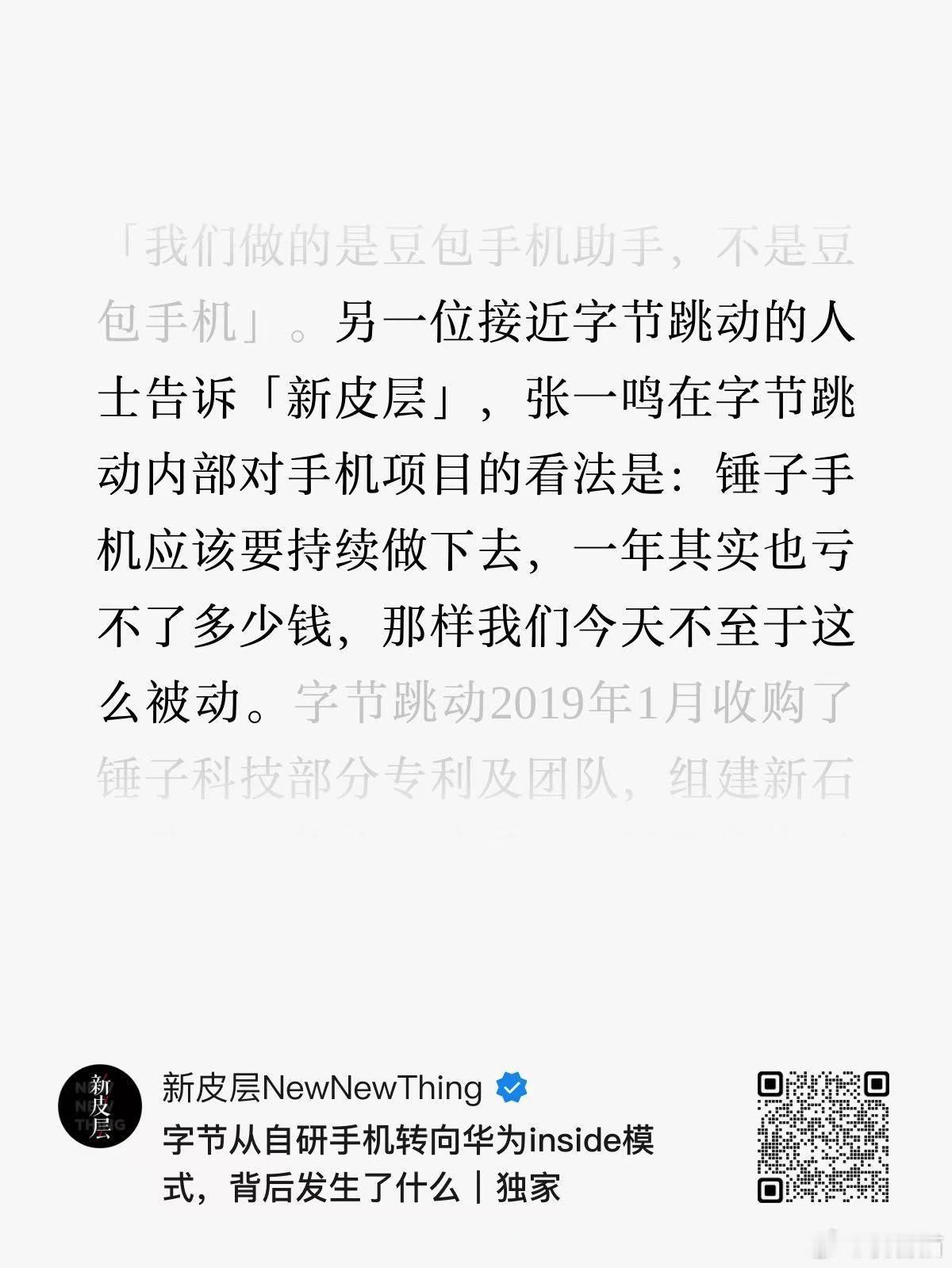 张一鸣内部讲话:锤子手机应该持续做下去,一年其实也亏不了多少钱,那样我们今天不至于这么被动。不过一位接近字节跳动该豆包手机合作项目的人士对第一财经「新皮层」称,这款手机基本算是字节自己研发的,但是迫于压力说的合作,其实中兴只是代工。