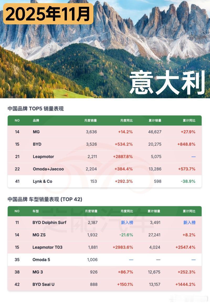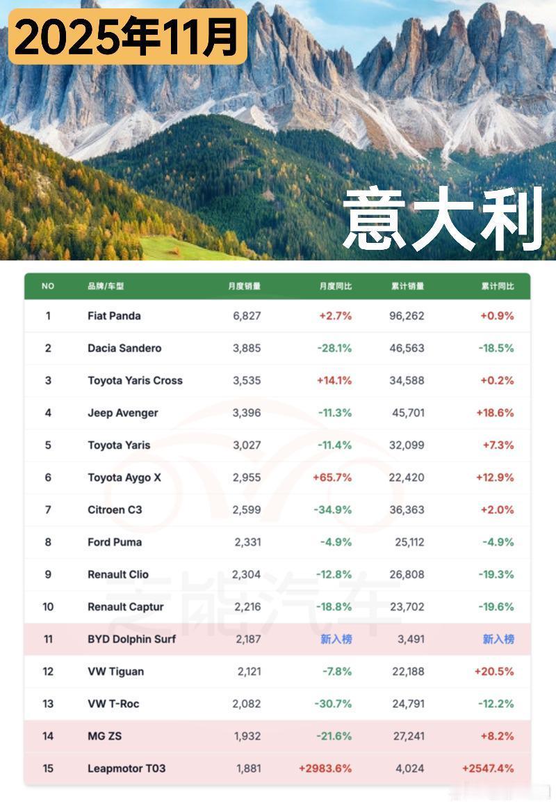 11 月意大利车市销量同比基本持平,混动成主流动力,燃油车占比下滑明显。中国品牌表现亮眼,多家品牌入围榜单,整体销量和市占率都有不错成绩,部分品牌实现爆发式增长,零跑更是成最大黑马。多款中国车型还杀入销量前 15。本土品牌菲亚特领跑市场,大众等传统品牌表现分化,小型车仍是当地核心需求