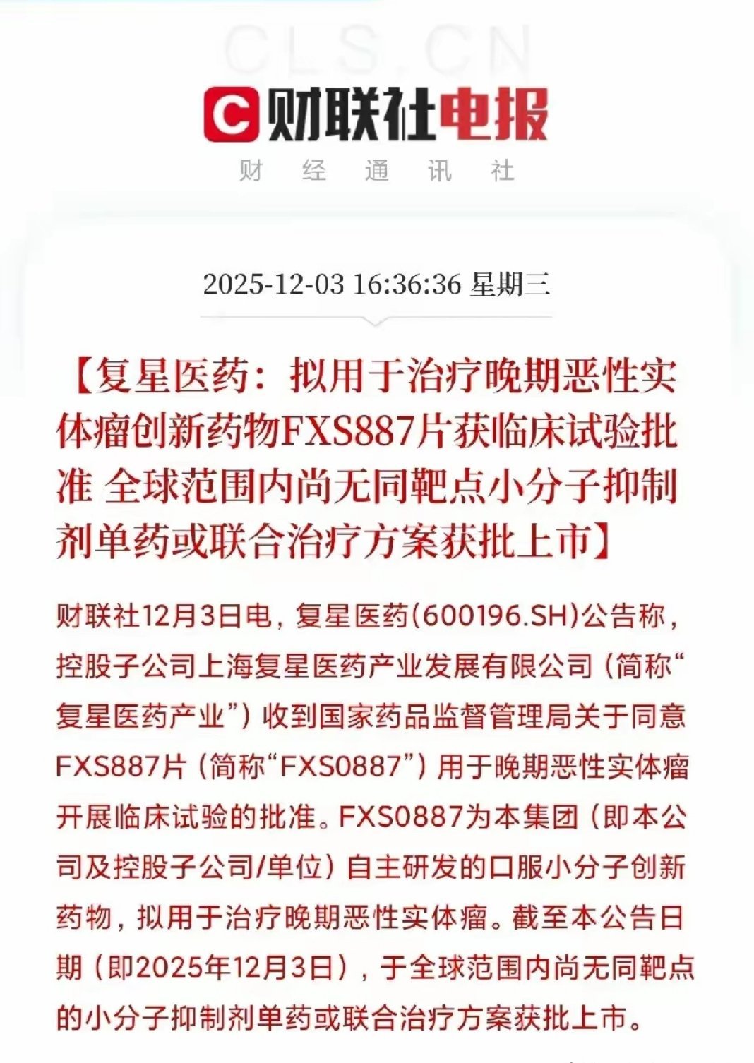 全球新突破!复星医药首款ATR激酶抑制剂获批临床,千亿抗癌赛道再迎强心剂医药板块传来重磅利好!复星医药自主研发的全球首创抗癌新药FXS887片,正式斩获国家药品监督管理局临床试验批件,即将启动晚期实体瘤I期临床试验。这款瞄准全新靶点的创新药,不仅填补了全球同领域治疗空白,更有望撬动千亿级蓝海市场,带动产业链上下游企业同步受益。核心突破:直击肿瘤治疗痛点,抢占全球新赛道FX抢占全球新赛道FXS887片是一款高选择性口服ATR激酶抑制剂,其核心作用机制聚焦肿瘤细胞的“DNA损伤修复”通路——通过特异性抑制ATR激酶活性,阻断肿瘤细胞周期进程,从根源上抑制恶性增殖。值得关注的是,全球范围内尚无同靶点药物获批上市,这款“全球新”药物的研发推进,标志着复星医药在肿瘤创新药领域实现了从“跟跑”到“领跑”的跨越,成功抢占空白治疗赛道。三重逻辑支撑,复星医药估值有望重估1. 创新药管线进入密集兑现期此次FXS887获批并非孤例,复星医药的创新研发实力已形成持续输出能力。2025年前三季度,公司创新药收入突破67亿元,保持高增长态势;从首个国产CAR-T疗法出海、PD-1单抗覆盖近40个国家和地区,到多款自研小分子药成功获批,再到如今全球首创ATR抑制剂进入临床,公司创新成果正加速落地,研发转化效率行业领先。2. 千亿市场空间打开成长天花板FXS887针对的晚期恶性实体瘤赛道,涵盖肺癌、肝癌、胃癌等患者群体庞大的高发癌种,市场需求迫切且潜力巨大。截至目前,该药物累计研发投入约4400万元,以相对可控的成本撬动千亿级市场,未来商业化前景广阔。随着I期临床试验启动,药物的临床价值与市场空间将进一步得到验证。3. 从“仿创结合”到“源头创新”的估值重塑复星医药正加速向“源头创新”转型,估值逻辑已逐步脱离传统仿制药企业的市盈率框架。此前,公司HLX14成为首个在欧美获批的国产地舒单抗,验证了其国际化能力;此次FXS887作为全球首创品种,有望成为下一款重磅国际化药物,推动公司估值向创新药龙头企业靠拢,天花板亟待重估。产业链受益方向梳理1. 核心龙头:复星医药:作为药物研发主体,其创新药管线价值与国际化潜力将持续被市场挖掘,成为板块情绪核心标的;2. 创新药板块:恒瑞医药、百济神州等同样聚焦研发的头部药企,有望借助板块情绪回暖获得估值修复;3. CXO产业链:创新药研发与商业化过程中,CXO企业将直接受益于订单增长,重点关注药明康德、康龙化成、泰格医药、凯莱英、昭衍新药、药明合联、皓元医药等细分龙头。在医药板块经历长期调整后,复星医药这款全球首创抗癌药的临床获批,有望成为板块复苏的“导火索”。这不仅彰显了中国创新药企在顶尖科技赛道的研发实力,更预示着国内创新药产业正迈入高质量发展的新阶段。