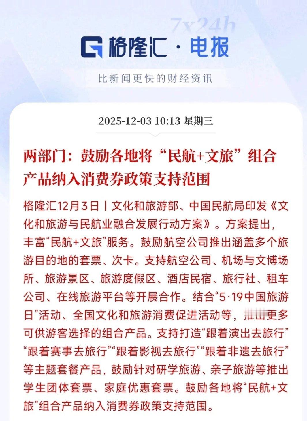 A股突发大利好!“民航+文旅”纳入消费范畴,板块直线拉升,中小航司成最大赢家A股盘中迎来重磅政策利好!相关部门明确鼓励各单位将“民航+文旅”组合产品纳入消费范围,这意味着“坐飞机+旅游”的套餐将实现报销、福利化常态化,既为消费者带来实惠,更直接激活民航与文旅两大行业的增长潜力,政策落地后民航板块直线拉升,成为当日市场焦点。一、政策核心亮点:组合消费常态化,双赢效应凸显此次政策的核心在于打破民航与文旅的消费壁垒,推动“机票+”组合产品规模化发展:- 产品形态多元化:“机票+景区通票”将成常态,比如飞往三亚可直接打包蜈支洲岛门票,前往西安能一站式拿下机票+酒店套餐,无需分开预订,大幅提升旅游便利性;- 消费场景扩容:企业可将这类组合产品作为员工福利采购,个人旅游也能享受套餐优惠价,既降低消费成本,又拓宽民航与文旅的需求市场;- 行业协同共赢:政策直接带动民航客运需求增长,同时为文旅行业注入客流,形成“民航拉客流、文旅促消费”的良性循环,两大行业有望同步迎来复苏升级。二、板块反应:民航股直线拉升,中小航司领涨政策利好一经释放,A股民航板块迅速反应,盘中直线拉升:- 华夏航空、春秋航空率先发力,股价快速冲高领涨板块;- 南方航空、中国国航、东方航空等头部航司同步跟涨,板块整体呈现普涨态势。从领涨格局来看,此次政策更偏向利好中小航司:一方面,中小航司在区域航线、低成本运营上具备优势,更易推出性价比高的“民航+文旅”套餐,精准对接旅游消费需求;另一方面,政策带来的增量客流,对中小航司的业绩弹性提升更为显著,成为资金追捧的核心逻辑。三、长期影响:激活行业增长潜力,产业链持续受益此次政策不仅带来短期情绪催化,更长期激活民航与文旅产业链的增长潜力:- 民航业:旅游出行需求的释放将直接提升航班客座率,带动客运收入增长,尤其是聚焦旅游航线的航司,业绩改善空间更为突出;- 文旅业:民航客流的注入将带动景区、酒店、餐饮等上下游消费,热门旅游目的地的相关企业有望持续受益;- 消费市场:“民航+文旅”消费的福利化、常态化,将进一步释放居民旅游消费潜力,推动消费市场扩容升级。综合来看,“民航+文旅”纳入消费范畴的政策,是兼顾民生消费与行业发展的双赢举措,短期为民航板块带来明确利好催化,中长期有望持续推动民航与文旅产业链共振增长。投资者可重点关注中小航司及旅游目的地相关标的,把握政策红利释放带来的结构性机会。