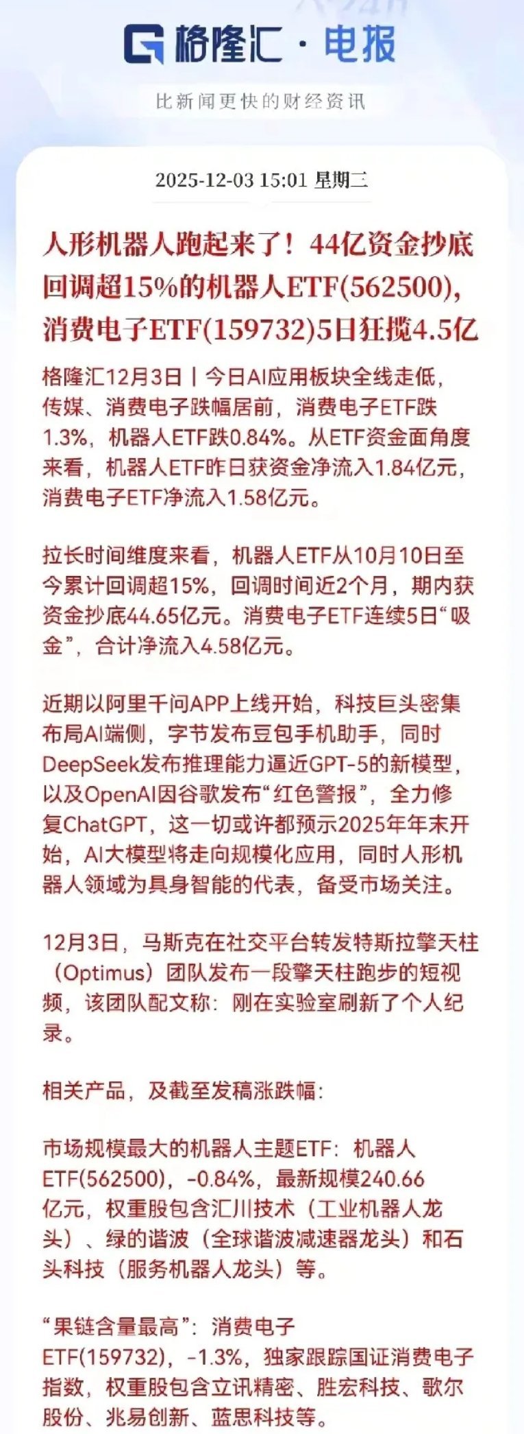 资金逆势抄底+产业催化共振,人形机器人+消费电子20只核心标的迎来布局窗口在AI应用板块短期回调的市场环境下,人形机器人与消费电子赛道正呈现“资金抄底+产业催化”的双重利好共振。格隆汇12月3日财经资讯显示,两大板块相关ETF持续吸金,叠加科技巨头技术突破与行业规模化应用提速,细分龙头标的迎来估值修复与成长机遇。板块资金动向:逆势布局信号明确资金对两大赛道的配置热情凸显长期信心:- 机器人ETF在近2个月累计回调超15%的背景下,逆势斩获44.65亿元资金净流入,仅12月2日单日便吸金1.84亿元,超跌反弹动能持续积聚;- 消费电子ETF连续5个交易日资金净流入达4.58亿元,12月2日单日流入1.58亿元,板块回暖趋势得到资金验证。资金逆势布局的背后,是行业端多重催化因素的持续落地,为板块估值修复提供了坚实支撑。行业核心催化:技术突破+应用落地双线发力1. AI端侧规模化应用加速阿里千问APP、字节豆包手机助手等终端产品密集落地,DeepSeek新模型迭代与ChatGPT功能修复,推动AI大模型从云端向终端渗透,消费电子作为核心载体迎来需求升级;2. 人形机器人技术突破落地特斯拉Optimus擎天柱跑步视频发布,标志着具身智能技术取得关键进展,人形机器人从研发阶段逐步迈向量产临界点,核心部件供应商直接受益于产业爆发红利。相关ETF精准覆盖两大领域细分龙头,为资金提供了高效的布局工具。核心标的全梳理:细分龙头+巨头绑定+业绩兑现一、人形机器人板块(核心部件+整机布局)1. 汇川技术(机器人ETF权重股):工业机器人龙头企业,核心产品覆盖伺服系统、控制器等关键部件,作为ETF核心权重标的,在44亿元资金抄底背景下,有望借助人形机器人部件需求增长实现估值修复;2. 绿的谐波:全球谐波减速器领军企业,特斯拉Optimus核心供应商,三季报净利润同比增长59.21%,动态PE仅11.8倍,成本较进口产品低40%,社保基金等国家队持仓超1807万股,安全边际突出;3. 石头科技(机器人ETF权重股):服务机器人龙头,聚焦扫地机器人赛道并积极布局具身智能,受益于消费端需求回暖与ETF资金配置,短期行情修复可期;4. 三花智控:全球仅有的两家能生产人形机器人热管理液冷模组的企业之一,与特斯拉签订三年80亿元关节模组订单,全年相关订单超12亿元,国家队持仓超7408万股,业绩确定性强;5. 拓普集团:深度绑定特斯拉,布局人形机器人直线/旋转执行器、灵巧手电机等核心部件,同时覆盖躯体结构件、传感器等多环节,成为产业链全能型供应商;6. 埃斯顿:工业机器人龙头,获机构密集调研,人形机器人关节模组研发持续推进,历经近2个月超15%回调后,超跌反弹空间显著;7. 柯力传感:六维力传感器龙头企业,已向50家人形机器人企业送样,上半年净利润同比增长47.9%,核心产品覆盖关节扭矩、六维力/力矩等关键应用场景;8. 江苏雷利:人形机器人22自由度灵巧手核心供应商,该部件成本占机器人总成本的20%-30%,子公司相关产品已实现量产,订单进入逐步释放期;9. 奥比中光:3D结构光相机领域标杆企业,为全球首个人形机器人马拉松赛事夺冠机型提供传感器,上半年营收同比增长104%,实现净利润扭亏,成长动能强劲;10. 科大讯飞(机器人ETF权重股):AI大模型与具身智能协同发展,深耕机器人语音交互系统,技术落地进度行业领先,作为ETF权重股持续获得资金配置青睐。二、消费电子板块(AI硬件+巨头供应链)11. 立讯精密(消费电子ETF权重股):“果链”核心企业,业务覆盖AI服务器连接器、Apple Vision Pro模组,同时汽车电子业务营收占比已达20%,受益于ETF连续5日资金流入,多赛道协同增长;12. 工业富联:全球电子制造龙头,AI服务器市占率高达45%(为英伟达核心供应商),消费电子代工覆盖苹果MacBook、华为折叠屏等旗舰产品,总市值超1.2万亿元,前三季度营收与净利润双双增长超35%;13. 胜宏科技(消费电子ETF权重股):PCB行业龙头,深度绑定消费电子+AI硬件双赛道,三季报净利润同比增长超50%,订单需求旺盛,跟随ETF吸金趋势持续受益;14. 歌尔股份(消费电子ETF权重股):VR/AR设备全球市占率超70%,拿下Meta Quest 5独家代工订单,汽车电子业务增速达60%,多业务线齐头并进;15. 兆易创新(消费电子ETF权重股):存储芯片核心企业,为消费电子提供闪存、MCU产品,AI硬件芯片需求提升带动业绩增长,成为资金布局核心标的;16. 蓝思科技(消费电子ETF权重股):全球玻璃盖板龙头,积极布局人形机器人结构件,全年预计出货人形机器人3000台,前三季度营收同比增长16.08%,跨界布局打开成长空间;17. 领益智造:消费电子精密结构件领军企业,绑定苹果、华为等头部品牌,前三季度净利润同比增长27%,汽车电子业务快速拓展,形成新增长极;18. 东山精密(消费电子ETF权重股):同时布局PCB与消费电子结构件,深度切入苹果、华为核心供应链,产能规模行业领先,跟随板块回暖趋势获资金关注;19. 长盈精密:消费电子与人形机器人部件双赛道布局,灵巧手指节公差控制精度达±0.01mm,上半年机器人业务收入同比激增246%,成为资金逆势布局的焦点;20. 环旭电子:消费电子SiP模组龙头,供应苹果、三星高端机型,技术壁垒高,订单稳定性强,在板块回调后迎来估值修复窗口。投资逻辑总结上述20只核心标的全面覆盖人形机器人与消费电子产业链关键环节,兼具短期超跌修复与中长期成长逻辑:短期来看,机器人ETF与消费电子ETF持续吸金,为板块提供资金支撑,超跌标的具备较强反弹动能;