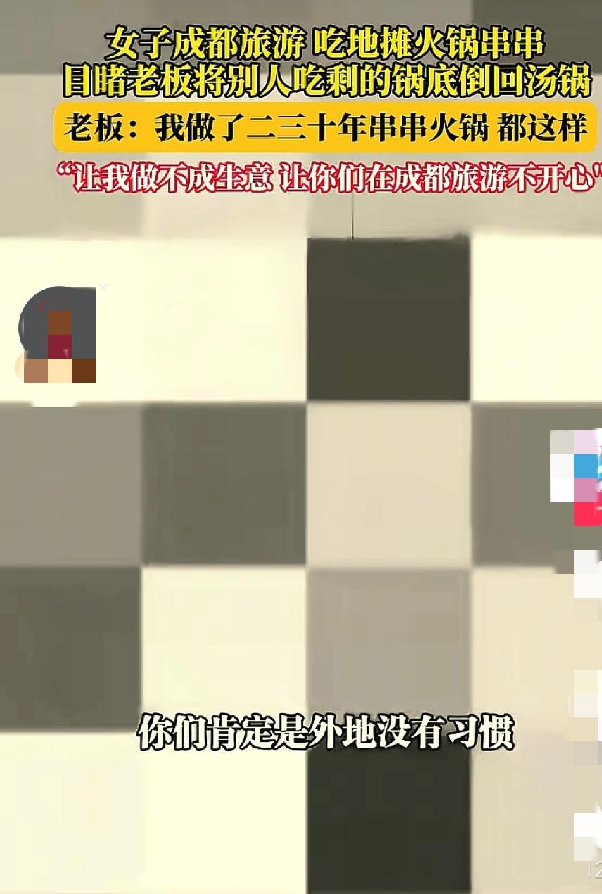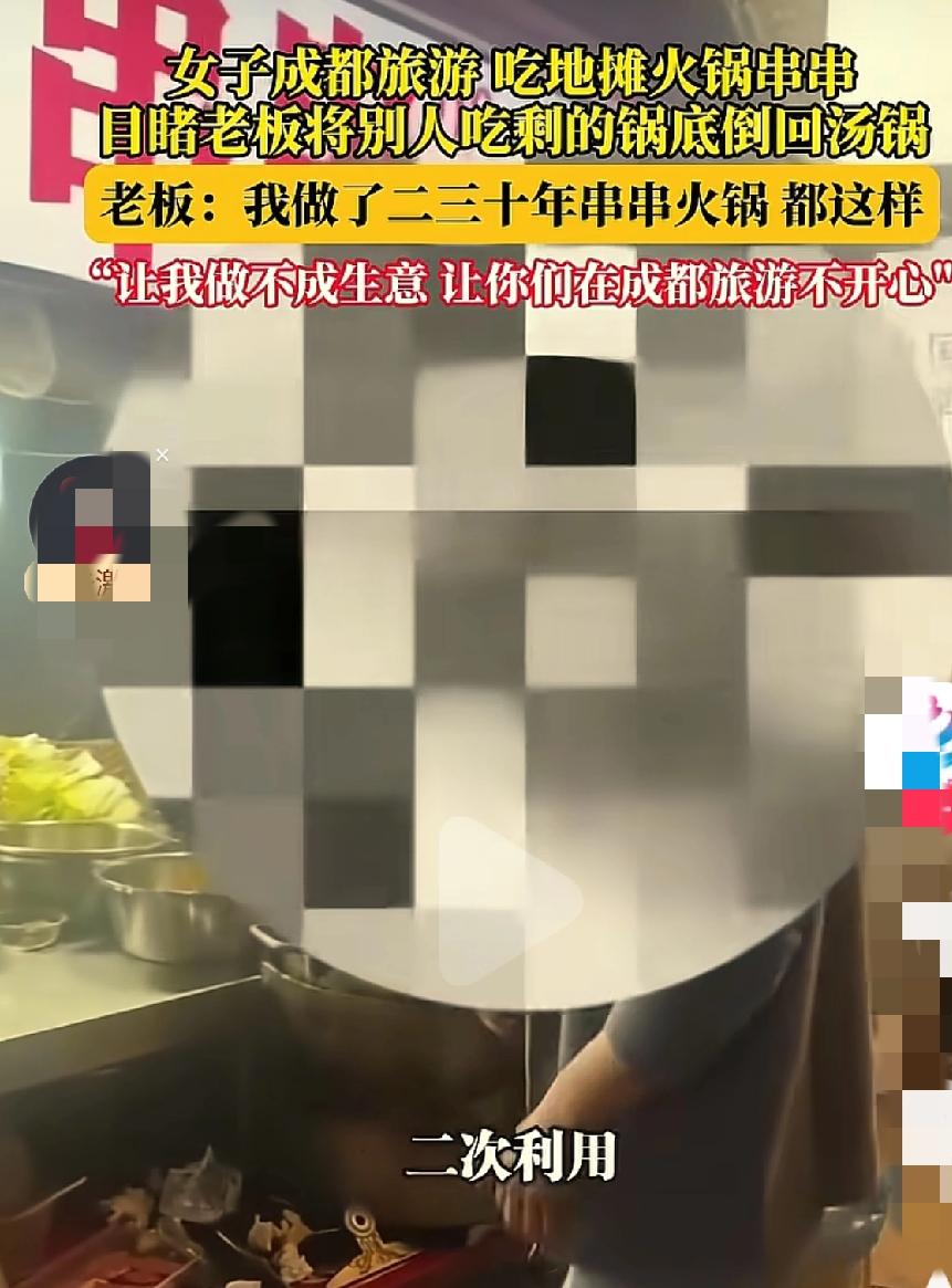 四川成都,一女子去成都旅游时,点了一份串串香,过程中女子看见老板将顾客吃剩的锅底倒回汤锅后,找老板理论,万万没想到,老板:“你今天要是让老 子做不成生意,我让你们在成都旅游不开心!” 女子杜女士来到成都旅游,早就对成都的串串香垂涎三尺了。中午时分,杜女士开开心心的来到一家串串香店里,准备敞开肚子大吃特吃。 可是在杜女士点串串香的时候,不经意间发现老板居然将顾客吃剩的锅底倒回汤锅。杜女士瞬间感觉恶心不已,便上前找老板理论:“你怎么把吃过的锅底往里面倒啊?” 老板毫不在乎的说:“我们这边都是这样,你是来旅游的不习惯正常!” “那也不能把别人吃过的往汤锅里倒啊,你让我们吃别人吃剩下的吗?”杜女士气愤的说。 “你要吃你就吃,不吃就走人,我们这边都是这样,我做了二三十年的串串火锅都是这样,你如果非要跟我胡搅蛮缠,让老 子做不成生意,老 子让你在成都耍的不开心!”老板恶狠狠的说。 老板真的是可恶至极,他怎么能够这么横?是谁给他的底气? 用顾客吃过的锅底回收二次使用也就算了,居然还敢威胁游客,是谁给他的勇气?无法无天了吧他? 这让我想起08年的时候,我和老公回重庆,经过四川达州的时候,我拉着行李箱不小心撞倒了摆在路边的甘蔗,甘蔗是去了皮砍成小段放在一个盆里,盆放在背篓上,而背篓呢正好放在路边的斜坡上! 甘蔗被撞倒后,我立马给人家道歉,并说这弄脏了的甘蔗我全买了,大概也就是一根甘蔗的样子。我老公给他50被拒绝。 可摊主不乐意了,非让我赔他200元,这时,我老公也生气了,不就是一根甘蔗吗?我又没说不买,凭啥要给你两百块! 争论了几句之后,一旁几个跑摩的的司机过来劝我和老公:“就200块,给他吧!”其中一个边说还一边敞开他的衣服让我们看,我看见他衣服都内兜里插了好几把刀! 老公见势不对,立即报了警,警察很快赶到现场,将我们双方的身份证信息登记了下来后,对摊主说:“别人跟你道了歉也愿意买你的甘蔗,你啥意思?想干啥?你说这甘蔗多少钱?让她赔你便是!” 摊主支支吾吾的还瞪了我老公一眼说:“20块钱!” 我二话没说掏出二十块钱就递给了他!当然他的甘蔗我也没有要! 事后,警察让摊主该干嘛干嘛去,警察走之后,老公立即拉着我进了车站! 这件事情已经过去了很多年,仍然不能忘记!