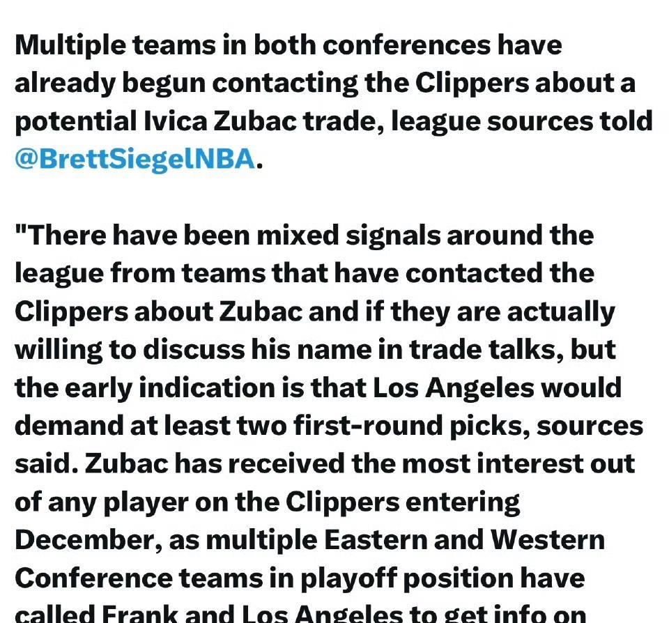 记者Brett Siegel报道,东西部已有多支球队开始联系快船,探讨关于祖巴茨的潜在交易: “联盟里向快船询问祖巴茨的球队释放出了复杂信号,目前还不确定快船是否真的愿意在交易谈判中提及祖巴茨的名字,但初步迹象显示,快船方面至少会要求两个首轮签。” 祖巴茨本赛季场均16.3分11.6篮板2.6助攻1.0盖帽,投篮命中率59.8%。去年夏天提前续约3年5860万美元合同。