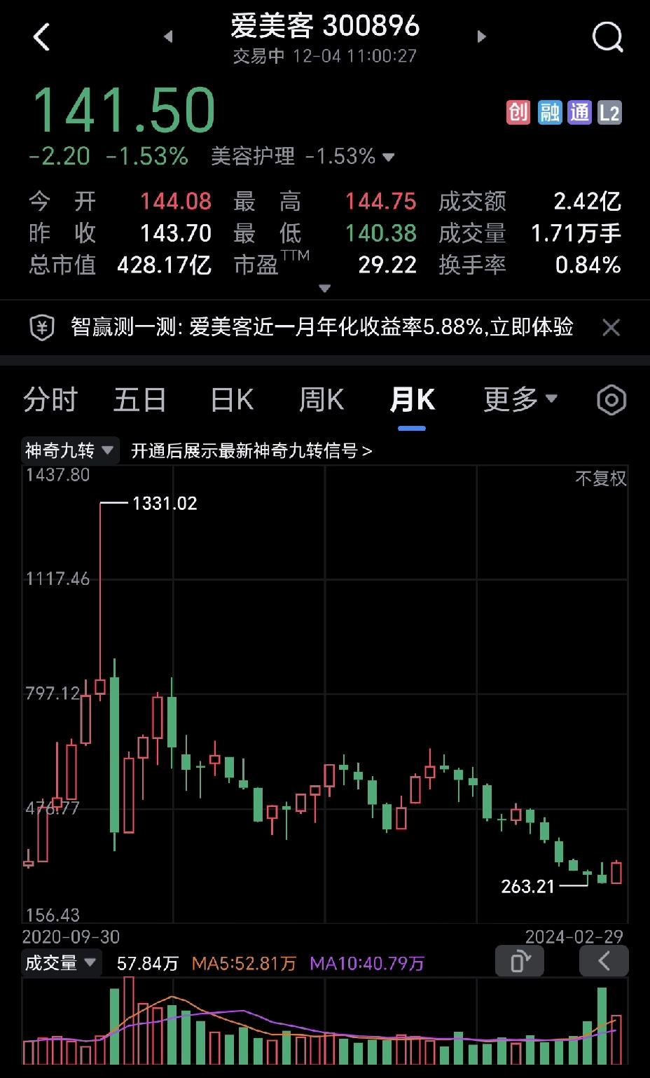 爱美客这只美容龙头股,当年最高冲到了1331元,天哪,比茅台只差一步之遥,可惜,后来该股一直调整,到了现在只剩一个零头了。 当年我一个同学重创该股,赚的是盆满钵满,当年很多人喊出了冲上2000元的口号。 理想很丰满,现实很骨感,没想到一路下跌,没两年股价只剩141元。 这种被爆炒的股票太可怕了,如果买在山顶,到现在只能哭晕在厕所,根本不可能再有解套的可能。 现在有多少散户深埋在这只股票里,等待着黎明的到来。 大家还看好这只美容股吗?