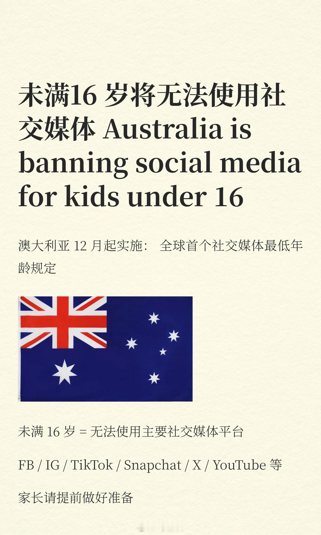 澳大利亚将禁止16岁以下用社交媒体,目的是“为了保护青少年免受网络色、暴力、自 C、饮食失调等内容的影响”,平台不删除未成年人账号将被重罚,12月10日正式生效。包括Facebook、Instagram、Reddit、Snapchat、Threads、TikTok、X和YouTube在内的社交平台,如未采取合理措施删除16岁以下澳大利亚儿童和青少年账号,将面临最高5000万澳元的罚款。不止澳洲,上个月马来西亚宣布,自2026年起将禁止16岁以下儿童和青少年使用社交媒体账户。如今,总部位于悉尼的“数字自由计划”组织推动高等法院能发出禁令,阻止该法律下周生效。澳洲网络上多数家长是支持这一决定的,但反对声音也不小,和国内家庭一样,也有不少家庭其实是靠着孩子的账号谋生,住在澳大利亚 Perth 珀斯的知名UTube 博主"Empire Family"宣布,为规避该国即将实施的16岁以下未成年人社交媒体禁令,全家决定迁居英国伦敦。因为这个网红家庭的主要阵地集中在YouTube:儿子Prezley (17岁)账号拥有280万订阅,家庭主账号粉丝量达180万。14岁的女儿Charlotte,有 53.6万 UTube订阅者、18.8万Ins 粉丝与28.4万TikTok 追随者, 与17岁的Prezley都是拥有独立平台的创作者,经常获得重要商业合作机会与品牌合约。对14岁的Charlotte,而言,这项新规意味着失去全部成果。澳将禁止16岁以下用社媒澳规定平台违反社媒禁令可罚2.3亿澳社媒不删未成年账号将重罚 热点现场