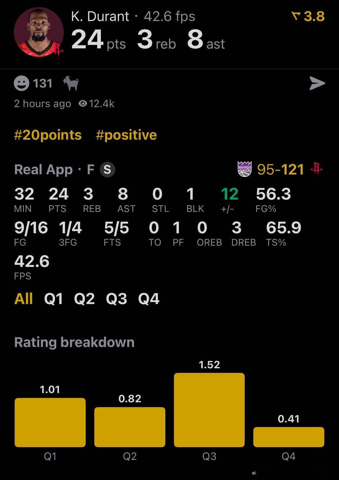 休斯顿火箭 杜兰特-我的评分:阿杜今天可以评五星!!!今天出战32分钟16中9拿下:24分 | 8助攻 | 3篮板 | 1盖帽🔥今天的助攻个个精彩!!休斯顿火箭国王vs火箭nba趣评分