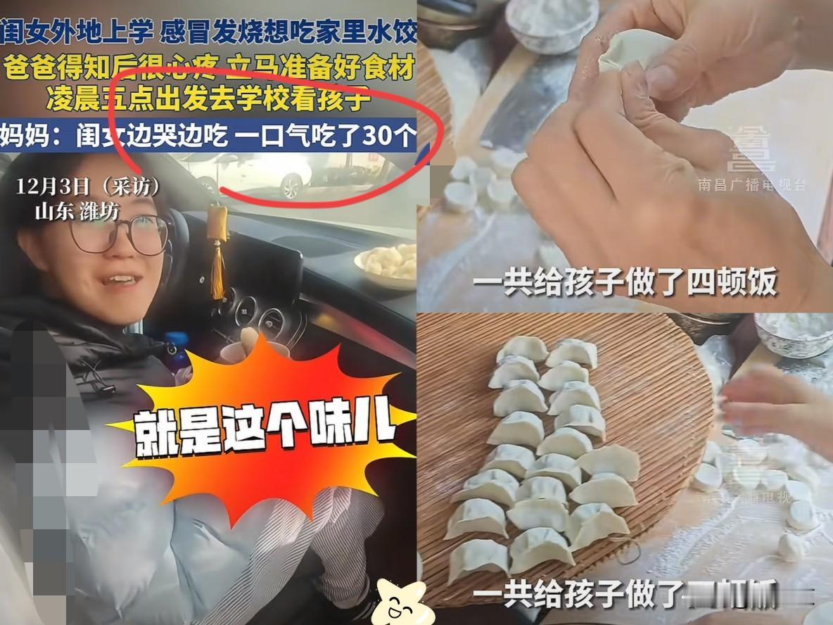 “可怜天下父母心!” 一女生坐在车上吃着水饺, 转身高兴的对爸爸说:“就是这个味!” 女生在南京上大学感冒发烧没胃口,随口跟爸爸说想吃家里的白菜熟肉水饺,山东老爸直接驱车5个半小时赶去,在学校门口后备箱现包现煮,这哪是饺子,是刻在父母骨子里的偏爱啊! 女孩一句无心的念想,爸妈却当了头等大事。怕路途遥远饺子凉了失了味,干脆带着新鲜食材上门,蹲在后备箱忙活半天,就为让女儿吃上一口热乎的,连做四顿饭陪着,这份用心真的戳中泪点! 我们总在外面假装坚强,却忘了父母永远是最坚实的后盾。那些你随口一提的喜好,他们默默记在心里;你脆弱无助时的撒娇,他们拼尽全力回应,从不怕麻烦! 所谓家人,就是不管你多大,在他们眼里永远是需要疼爱的孩子。这份藏在烟火气里的细碎关怀,才是治愈我们所有疲惫的良药! ​大家觉得呢?欢迎大家评论区讨论留言!