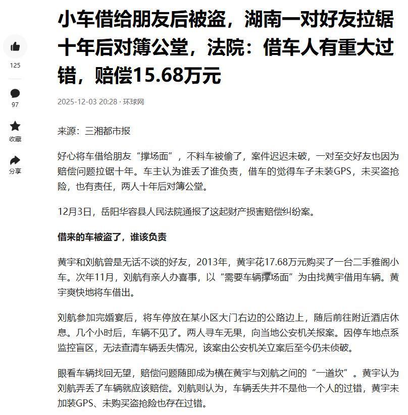 湖南岳阳的黄宇,花17.68万买了辆二手雅阁,好友刘航因家办喜事找他借车撑场面,黄宇爽快答应。几天后,刘航称把车停小区外公路后去酒店休息,回来发现车丢了,两人四处找并报了警,但因停车处是监控盲区,车没找回,黄宇要求刘航照价赔偿,刘航却认为黄宇没装GPS、没买盗抢险也有过错,只愿赔3万,还要求分期每月赔付500元,两人为此拉锯10年,关系破裂。最终,黄宇将刘航告上法庭,索赔20万。 2014年,黄宇花17.68万买了辆二手雅阁。 黄宇和刘航是多年的好友,平日里互帮互助,关系十分要好。 同年11月,刘航家办喜事,黄宇觉得借车给他撑场面是理所应当的事,便毫不犹豫地答应了。 可谁能想到,这车借出去没几天,就出了大问题。 几天后,刘航慌慌张张地打来电话,说车停在小区外公路,去酒店休息后回来车就不见了。 黄宇得知后,赶紧和刘航四处寻找,还报了警。 可停车的地方是监控盲区,根本找不到车的踪迹。 黄宇这下急坏了,这车可是他花了十几万买的,就这么没了,他实在接受不了。 于是,他要求刘航照价赔偿。 可刘航却有自己的想法,他觉得黄宇没装GPS,也没买盗抢险,也有一定的过错,所以只愿意赔3万,而且还要分期,每月500元。 这赔偿金额差距实在太大,黄宇肯定不同意。 两人为此开始了长达10年的拉锯战,每次见面都因此事,吵得不可开交。 原本亲密无间的兄弟情,在这漫长的赔偿纠纷中,消失殆尽。 这10年里,黄宇一直憋着一口气,他觉得刘航太不地道,借了车弄丢了还不肯好好赔偿。 而刘航却觉得黄宇也有责任,凭什么要他一个人承担这么大的损失。 到了2025年3月,黄宇实在是忍无可忍了,他觉得不能再这样耗下去了,于是决定将刘航告上法庭,索赔20万。 这一下,两人的矛盾彻底激化了。 刘航弄丢了借来的车,该不该全额赔偿,以及黄宇没装GPS、没买盗抢险是否要承担责任呢? 1,刘航觉得: 自己虽然弄丢了车,但黄宇也有过错,车没装GPS,丢了之后很难找回。 没买盗抢险,保险公司也不会赔偿,所以黄宇应该承担一部分损失。 他提出的3万赔偿,虽然和黄宇要求的差距很大,但他觉得自己已经做出了让步。 2,黄宇认为: 车是借给刘航的,刘航就有保管好车的义务。 车丢了,就是刘航的责任,和自己装不装GPS、买不买盗抢险没有关系。 他要求刘航照价赔偿,是合理合法的。 3,那么,从法律的角度该如何分析这件事呢? 【1】刘航借了黄宇的车,这就形成了一种借用合同关系。 根据《民法典》的规定,借用合同是出借人将借用物交付给借用人使用,借用人按照约定使用借用物,并在使用完毕后将借用物返还给出借人的合同。 黄宇把车借给刘航,刘航就有义务妥善保管这辆车。 可刘航却把车停在了监控盲区,导致车丢失,这明显是没有尽到妥善保管的义务。 民法典还规定,借用人因保管不善造成借用物毁损、灭失的,应当承担赔偿责任。 所以,刘航弄丢车,必须承担赔偿责任。 【2】黄宇没装GPS、没买盗抢险。 装GPS和买盗抢险,这是车主自己的选择,和车丢失并没有直接的因果关系。 车丢失是因为刘航停车不当,没有尽到保管义务,而不是因为黄宇没装GPS或者没买盗抢险。 所以,黄宇在这件事上没有过错,不需要承担责任。 虽然车是二手的,但买时花了17.68万,经过一段时间的使用,会有一定的折旧。 可以根据车辆的折旧情况,来确定刘航应该赔偿的金额。 4,刘航提出黄宇有责任,这种想法合理吗? 根据民法典规定,借用人的保管义务是独立的,和出借人的其他行为无关。 黄宇没装GPS、没买盗抢险,不影响刘航的保管责任,所以刘航的想法不合理。 5,如果刘航真的无力一次性赔偿,该怎么办? 根据民法典规定,当事人一方不履行合同义务或者履行合同义务不符合约定的,应当承担继续履行、采取补救措施或者赔偿损失等违约责任。 刘航可以和黄宇协商分期赔偿,就像他之前提出的每月500元,但如果黄宇不同意,刘航还是要想办法一次性赔偿,或者通过其他合法途径解决。 最终,法院判决刘航赔偿黄宇15.68万元。 车外借,可不是一件小事。 出借人要谨慎考虑,提醒对方保管好车辆。 借用人要认真对待,尽到保管义务。 不然,一旦出了问题,不仅会伤了和气,还可能惹上官司。