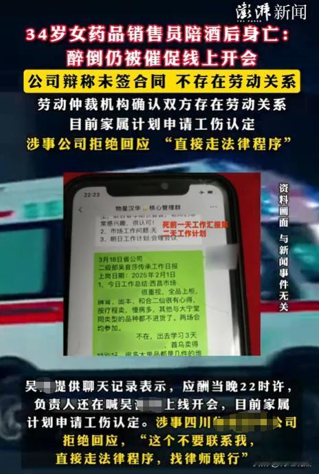 四川,34岁女销售小吴,为完成业绩陪客户喝酒,期间公司负责人还催她参加晚上10点多的线上会议,酒局结束后,小吴头晕眼花回到住处。次日下午,室友发现她没了气息,家属悲痛万分,找公司讨要说法,希望认定为工伤,公司却翻脸不认账,否认存在劳动关系。家属气愤之下申请劳动仲裁,仲裁委员会介入调查,确认双方劳动关系成立,可公司仍不担责,家属计划申请工伤认定。 34岁的小吴,在一家公司做药品销售。 3月19日晚,为完成业务多拿奖金,她强颜欢笑陪客户喝酒,心里一百个不愿意,可就业环境差,只能硬着头皮一杯接一杯。 应酬时,公司还催她搞定客户,晚上10点参加线上会议,她身心俱疲。 小吴的母亲回忆,女儿平时工作特别拼,为了业绩常常加班。 那天晚上,她给女儿打电话,能听到电话那头嘈杂的声音,女儿说话都有些含糊不清,只说在陪客户喝酒,让她别担心。 母亲心疼女儿,叮嘱她少喝点,早点回家休息。 小吴在酒桌上,一杯接一杯地灌酒,就为了能拿下订单。 公司那边还不断发消息,催她搞定客户,晚上10点必须参加线上会议。 她心里又急又累,可为了工作,只能硬撑着。 好不容易酒局结束,她头晕目眩,走路都摇摇晃晃。 回到住处,小吴一头倒在床上,想着睡醒接着忙。 可这一睡,就再也没醒来。第二天下午,室友下班回来,看到小吴躺在床上一动不动,怎么叫都没反应。 室友慌了神,赶紧打电话给小吴母亲,又拨打了急救电话。 小吴母亲接到电话,感觉天都塌了。 她急忙赶到女儿住处,看到女儿冰冷的身体,她怎么也想不明白,女儿好好的一个人,怎么说没就没了。 她觉得女儿的死,和应酬饮酒有关,公司还喊女儿开会,应该认定工伤。 小吴的母亲找到公司,希望公司能给个说法,给女儿一个公道。 可公司却翻脸不认账,一口否认和小吴存在劳动关系。 小吴的母亲说,没想到公司会这么无情。 小吴的母亲,找到了小吴和公司签订的劳动合同,还有工作期间的打卡记录、工资发放记录等。 她带着这些证据,申请了劳动仲裁。 仲裁委员会介入调查,仔细核实了小吴母亲提供的证据。 经过一番调查取证,确认小吴和公司之间劳动关系成立。 可公司还是沉默不语,不愿意承担责任。 小吴母亲没有灰心,她决定继续为女儿讨回公道,计划申请工伤认定。 她知道这条路会很难走,但为了女儿,她愿意坚持下去。 公司的做法,合理吗?小吴的死,真的和公司没有关系吗?公司难道就可以这样逃避责任吗? 小吴虽回家后死亡,但饮酒应酬是工作行为,和死亡联系紧密。 应酬算工作时间延伸,现场是临时工作岗位,死亡与应酬有因果,符合突发疾病特征。 根据工伤保险条例第十五条规定,职工在工作时间和工作岗位,突发疾病死亡或者在48小时之内经抢救无效死亡的,视同工伤。 小吴为了完成工作任务,陪客户喝酒,这是工作行为。 应酬的时间和地点,虽然和常规的工作时间和地点,有所不同,但应酬是为了公司的业务,是为了完成工作任务。 所以,应酬可以看作是工作时间的延伸,应酬现场,就是临时的工作岗位。 小吴在应酬结束后回到住处死亡,虽然死亡地点不是常规的工作场所,但她的死亡和应酬饮酒有直接的因果关系。 而且从时间上看,她从应酬结束到死亡,间隔时间较短,符合突发疾病死亡的特征。 该事件中,即使没有书面劳动合同,如果有工资支付凭证、工作证、招聘登记表、考勤记录等证据,也能认定劳动关系。 小吴母亲收集的打卡记录、工资发放记录等就可以作为认定劳动关系的证据。 仲裁已经确认了小吴和公司之间的劳动关系,这就为工伤认定提供了基础。 如果工伤认定成功,公司就需要承担相应的责任,包括支付丧葬补助金、供养亲属抚恤金和一次性工亡补助金等。
