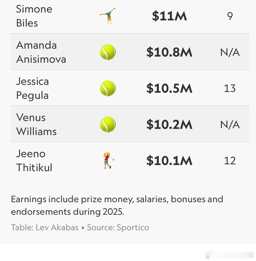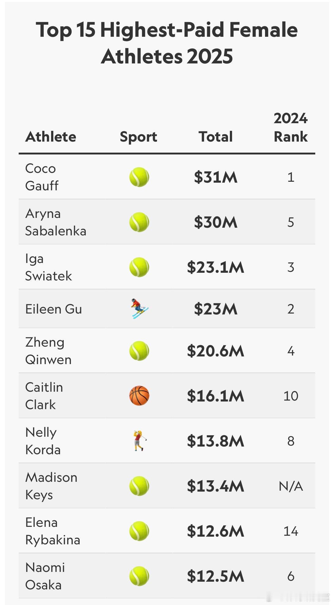 郑钦文全球女运动员收入榜第52025年收入最高的15位女运动员中,有10位是网球运动员:1 高芙 3100万2 萨巴伦卡3000万3 斯瓦泰克2310万5 郑钦文 2060万8 凯斯 1340万9 莱巴金娜 1260万10 大坂直美1250万12 阿尼西莫娃1080万13 佩古拉 1050万14 大威 1020万高芙连续第三年位居榜首,年收入达3100万美元,略高于她的竞争对手萨巴伦卡(3000万美元)。萨巴伦卡是继大坂直美、小威和高芙之后,第四位年收入超过3000万美元的女运动员。
