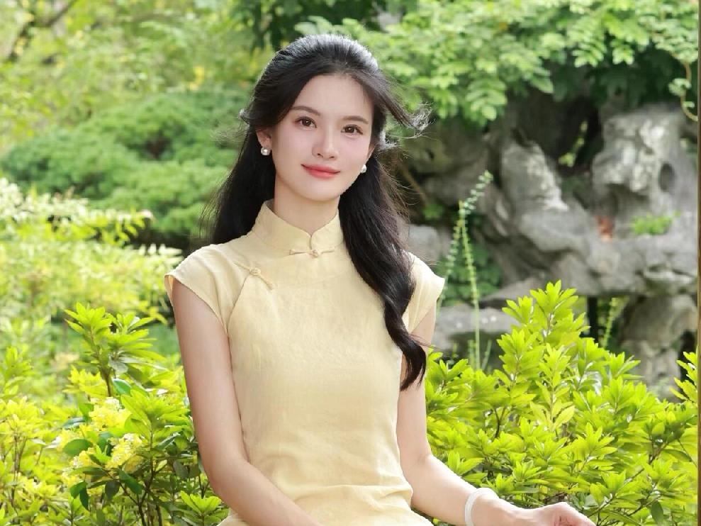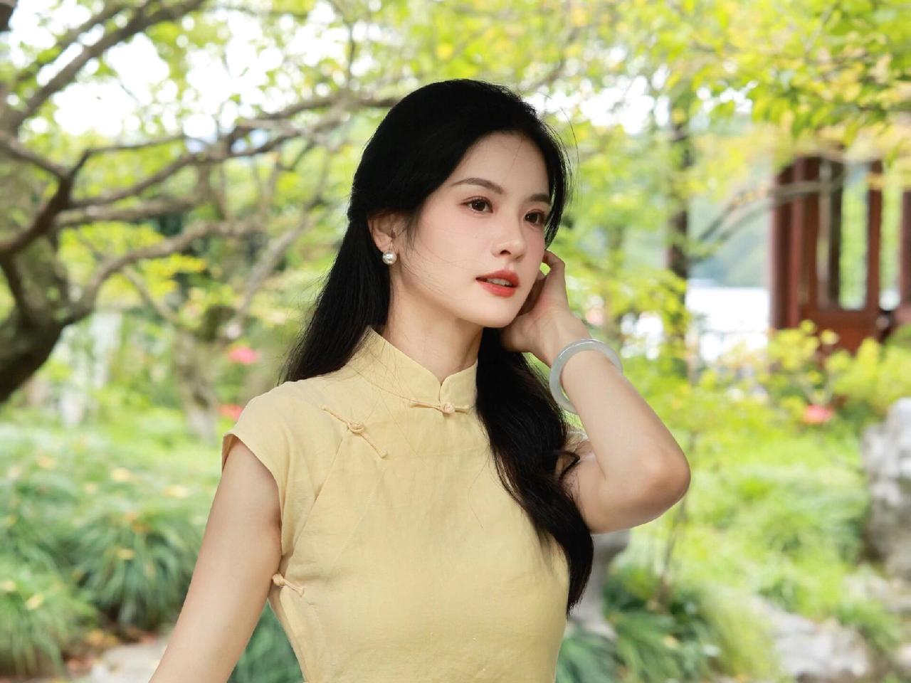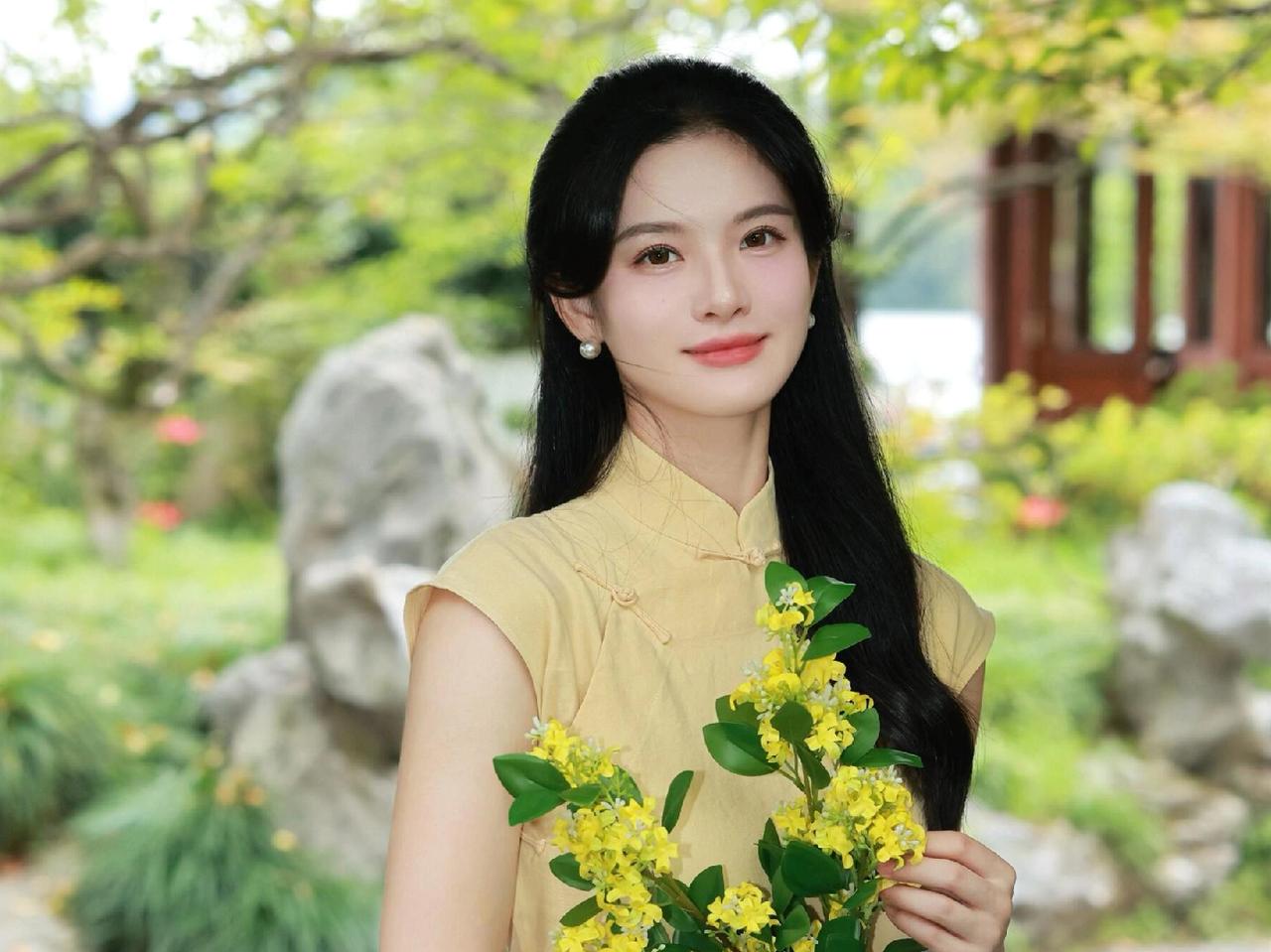 《鹧鸪天·桂香里的闲光》 作者Ⅰ朱珠 软柳风轻绕画亭,新黄裁作旗袍轻。 鬓边云鬓簪秋意,腕底银环浸露明。 花几簇,酒双听,桂香沾袖入瓶青。 廊间石畔晴光懒,半是蝉声半是宁。 桂庭闲记 晓光漫过朱漆栏,将庭中桂树描得愈发清透。穿嫩黄旗袍的女子倚着石桌闲坐,鬓边簪花轻颤,腕间银镯在晨光里流转着细碎光泽。 案上青瓷瓶插着几枝新折的桂,甜香漫进衣袖,混着石缝间漏出的蝉鸣,织成一片慵懒时光。 她执盏浅酌,目光掠过绕亭的软柳,风过处,柳丝轻拂肩头,惊起几只粉蝶蹁跹。 远处云影悠悠,庭中光影斑驳,连时光都似放慢了脚步,只余下这满庭桂香与满心安宁,在晨雾里慢慢氤氲开来。