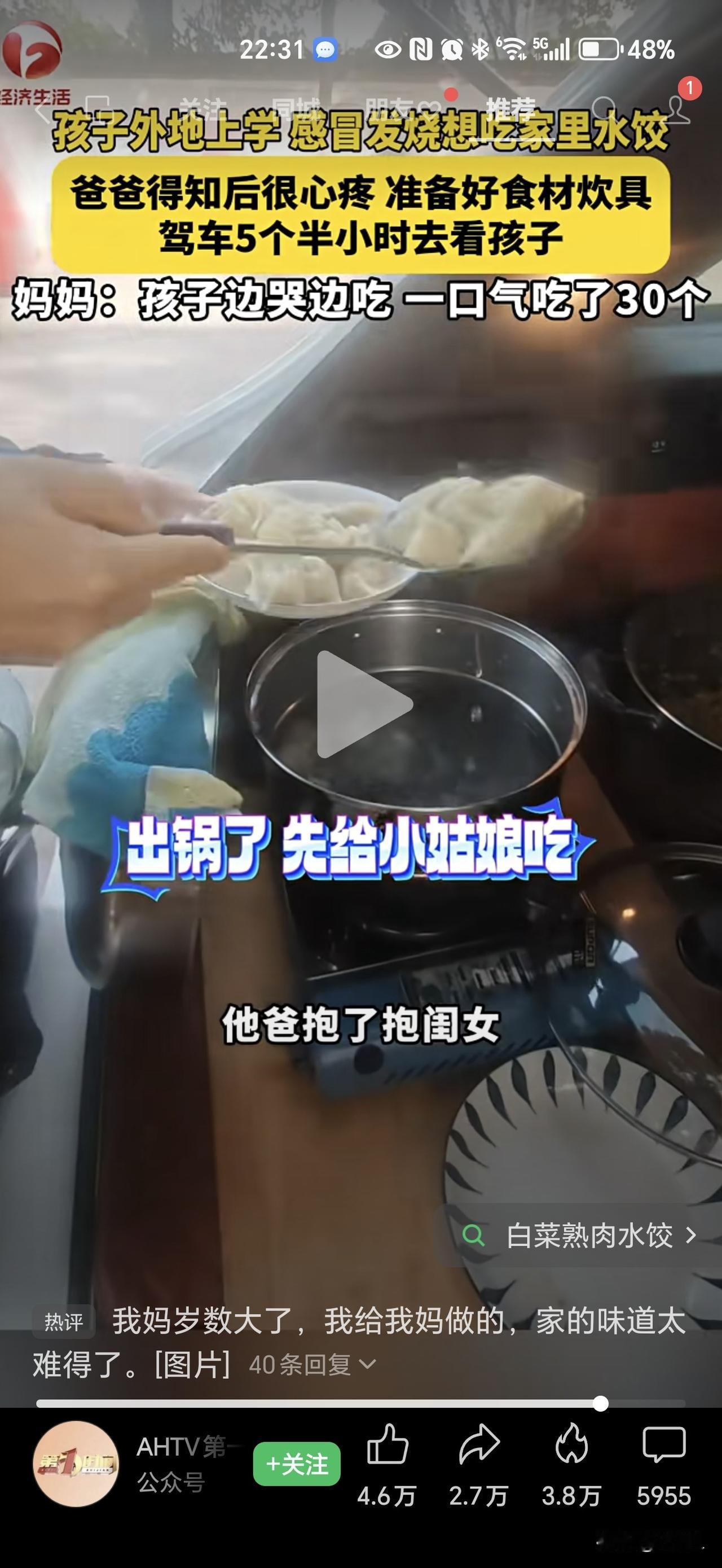 女儿一句想吃饺子,父母连夜驱车700公里送到校门口!网友:看哭了! 饺子下锅的那一刻,热气模糊了车窗,也模糊了一家三口的眼睛。 近日,山东潍坊,刘女士夫妻俩,因为远在外地的闺女说想吃家里包的饺子,俩人二话不说,驱车七百多公里,历时五个半小时,直接送饺子到校门口。 刘女士家里的这位宝贝闺女,今年第一次离开父母,去南京读大学。最近因为感冒发烧,就特别想家,更是想念家里的白菜熟肉饺子。 闺女的话一出,爱女心切的爸爸哪里还坐的住,当天晚上开始准备包饺子的材料,第二天一早刚5点,就带着全套家伙什,开车上路了。 一路开了五个多小时,到达南京,孩子学校门口,才告知了孩子,爸爸妈妈来了。 心疼闺女的爸爸,一刻也不停闲,和面、拌馅、包饺子,让闺女在千里之外,吃上了爸妈现包的热气腾腾的白菜熟肉水饺。 姑娘坐在副驾驶,迫不及待地咬了一口饺子,立马扭头冲着爸妈,带着哭腔说,“就是这个味!” 哎呀,我这当娘的心啊,瞬间破防,有什么事能比看到自己的心肝宝贝满足的吃上一口爸妈做的饭更让人欣慰啊? 或许是离家这么久,突然又吃到了这熟悉的味道,姑娘边哭边吃,这第一顿饺子居然吃了30个之多。 爸爸妈妈在给女儿连着吃了四顿饺子后,才收拾好东西,准备返家。 爸爸抱了抱闺女,轻轻拍着闺女的背说,“快过年了,放假就赶紧回家。 儿行千里母担忧,这话一点不假,别的忙帮不上,应该给的情绪价值必须到位。这才是真真正正的在富养孩子吧! 刘女士把这段经历分享到网上后,瞬间引发无数共鸣: “人到中年,一看这情形,心里就酸酸的,70后把童年缺失的父母那种关爱都无私给了孩子。” “我也看哭了,这个爸爸真好!” “这真不叫惯,有些心理需求必须满足。不然,家的感觉哪来呢!” “我听到她吃了30个一下子就哭了。” “我肯定也这样,闺女一声响,刀山火海也给闯。” “这要是我闺女,我也会飞过去给她包饺子🥟说实话听到这句话,就是这个味,鼻子酸了!” “想念那位曾经在1999年12月 ,因为我一句“宿舍褥子太薄”。在历经了14个小时的硬座,跨越千里出现在宿舍楼前,一手拎着羊毛褥子,风尘仆仆,一脸疲惫却依然笑容满面的爸爸!” “闺女高二,只要想吃东西,我单位中午下班就开车送过去,来回一个半小时,自己随便垫一点。她妈说别送了,我说没事!这样她将来没那么容易被感动,她爹都这样送饭!” “我深有体会。儿子高三压力大,给我打电话情绪低落,我心疼的不得了,开车去等孩子放晚自习,孩子一上车就一句话“妈,我压力嗨大”说完张嘴大哭。” 评论区里这样宠着孩子的很多很多,看的我一直热泪盈眶。 我儿子高中时,尤其到了高三,班里80%的孩子都陪读了,我也做好了一切陪读准备。 只是,儿子一直不让陪读,依然每周六下午接回来,周日傍晚送回去。即便后来学校说,周日白天会给高三开放教室,但儿子说不想去,就想在家待满整整一天,我二话不说,直接跟老师请假。 甚至高三下学期,儿子要求周三晚上回家住一晚,我们也是不问任何原因,直接帮他请假。 周三晚自习后回来,吃了宵夜,洗个澡,腻歪一会,躺着玩一会手机。周四一早,吃个他喜爱的早餐,又满血复活。 即便如今已经在外地读大三了,还会时不时的跟我们说: “妈妈,我想吃那个蓝白条的饼干了!” “爸爸,我想喝果啤了!” “妈妈,我想吃你做的炸小肉条了!” “妈妈,我想吃你炸的鱼了!” “爸爸,我想去海钓了!” “妈妈,我想吃韭菜肉的饺子了!” …… 没有二话,全部安排! 看上去好像是,孩子在要求吃的喝的,其实他们是在求爱的抱抱! 网友说的很好,这真的不是溺爱,而是给孩子提供满满的情绪价值,富养她的精神世界,温暖她小世界的角角落落。 等到将来,父母老去无法为孩子遮风避雨时,孩子会很坚强勇敢的面对风雨。而且,孩子也一定会成长为一个自爱的人,她知道被爱是什么感觉。所以她内心富足,也会爱别人。 一句“就是这个味”,一辆奔波千里的车,一顿热气腾腾的饺子——中国父母的爱,从来不说,只做。 信息来源于AHTV第一时间,侵联删! 带定位晒今日生活 我的今日状态:🏃➡️运动 我这里的天气:☀️晴天