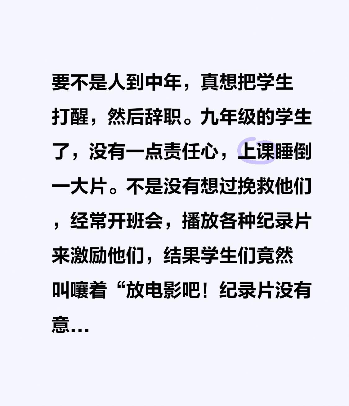 要不是人到中年,真想把学生打醒,即使被迫辞职。 九年级的学生了,没有一点责任心,上课睡倒一大片。 不是没有想过挽救他们,经常开班会,播放各种纪录片来激励他们,结果学生们竟然叫嚷着“放电影吧!纪录片没有意思。” 你想唤醒他的良性,结果人家根本没有心。 大部分学生都吸烟,这里的大部分还包括女生。 早恋在他们眼里非常正常,不正常的人才不早恋。 男生女生以“你媳妇”“你老公”互相打趣。 给他们讲不学习将来就业路窄,一名男生当面怼我“要你管”。 讲课没有人听,考试分数谁的最低,谁反而成了“英雄”。 于是,我们班的数学分数及格的一个没有,0分的倒是一堆。 动不动就请假,假条上说请半天假,结果第二天还没有来。 以把老师惹火为乐,顶撞老师成为课堂上的家常便饭。 各科成绩都是个位数,一个个还洋洋自得。 有时候想要组织个辩论会什么的,锻炼一下他们的表达能力,结果根本没有人配合。 自习课上男生全部去打球,几个女生在班级里化妆,来校长都管不住,派老师盯着上自习都盯不住。 我在讲台上讲课累得声音沙哑,看着睡倒一片的学生,心里特别堵得慌,真想打他们几拳,把他们打醒。 他们在外面打工的父母,看到这一幕该作何感想? 学校的学风为什么越来越差了呢?从什么时候变差了呢?