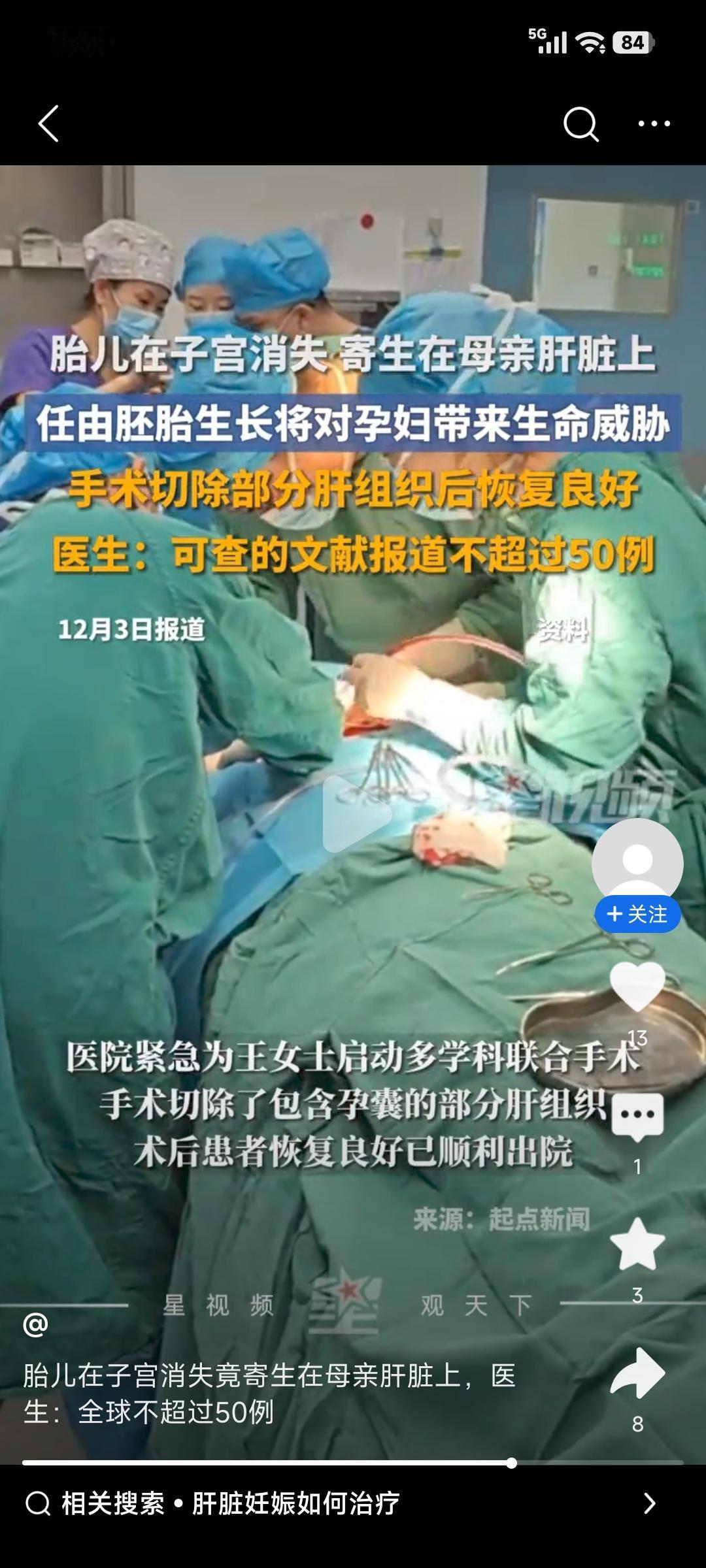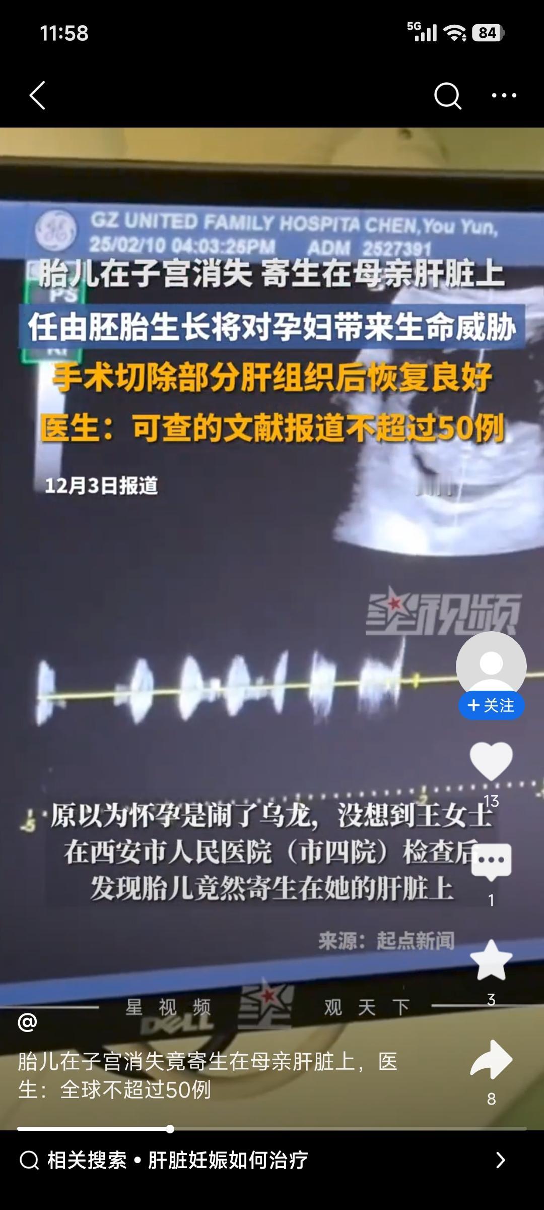 罕见的事儿真是年年有,今年特别多,胎儿居然在妈妈肝脏上“安家”了!西安一40岁的王女士,停经五十几天,抽血显示怀孕,可超声却在子宫和输卵管内都没找到孕囊。通常人绒毛膜促性腺激素到1000 - 2000mIU/ml左右就能看到孕囊,王女士都到9000mIU/ml了,还是看不到。最后竟发现胎儿长在了肝脏上,胎心搏动强劲,胎盘雏形也有了。 无独有偶,福建一名30岁女子也是子宫内无胚胎,最后确诊肝脏异位妊娠。这种情况极其危险,死亡风险远超普通宫外孕,好在及时手术,她已康复出院。全球这种病例不超过50例,真的太罕见了!